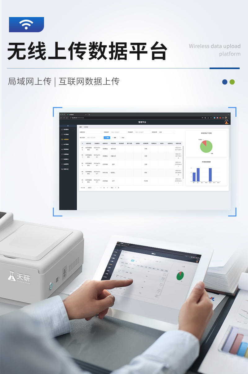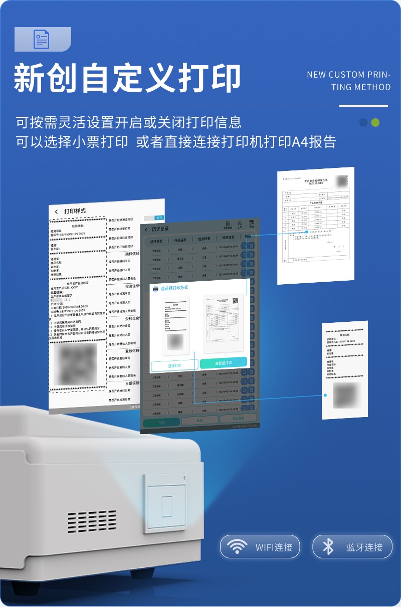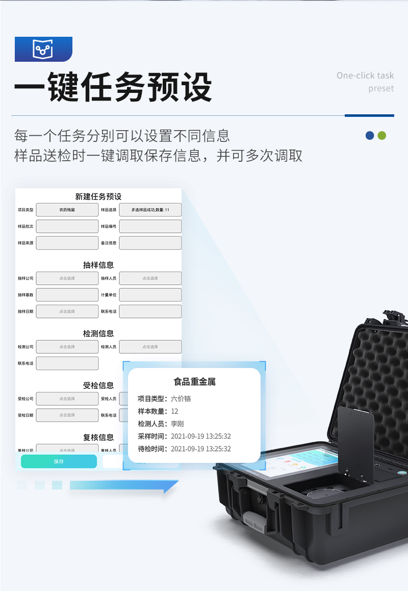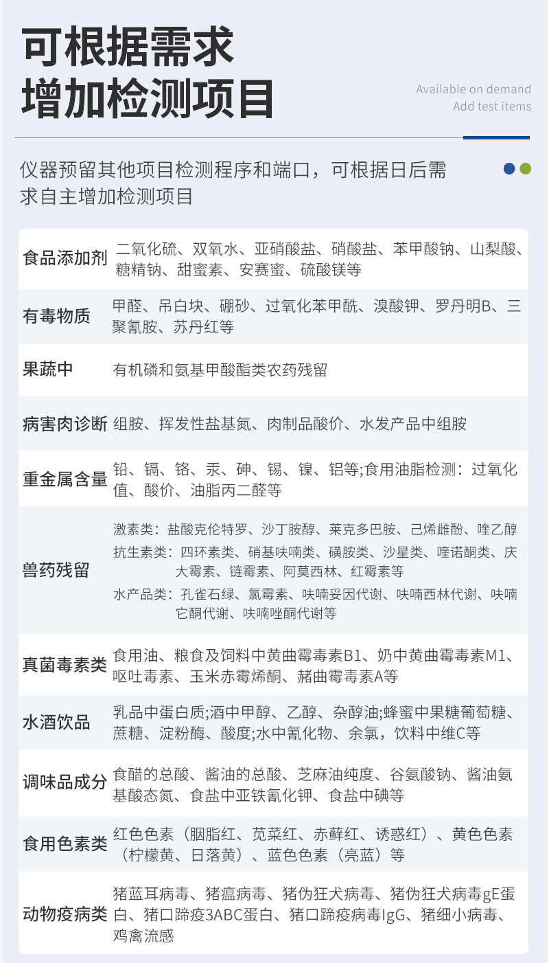 | 儀器采用手提一體化系統(tǒng)檢測(cè)技術(shù),將分光光度模塊、數(shù)字化管理模塊、無(wú)線通訊模塊高度集成于一體,可支持檢測(cè)60種食品安全檢測(cè)項(xiàng)目,同時(shí)預(yù)留升級(jí)檢測(cè)方法。 | 儀器檢測(cè)模塊標(biāo)準(zhǔn)化、智能化,檢測(cè)項(xiàng)目可隨意自由組合。檢測(cè)箱體內(nèi)置多個(gè)標(biāo)準(zhǔn)檢測(cè)單元,檢測(cè)模塊可以調(diào)整配置。 | 儀器采用全新安卓智能系統(tǒng),主控芯片采用 ARM Cortex-A7,RK3288/4核處理器,10.1寸高清液晶觸摸豎屏,更加**的UI交互界面,運(yùn)轉(zhuǎn)快捷;儀器配備無(wú)線通信模塊: 4G(APN)通訊模塊、Wifi模塊,藍(lán)牙傳輸,同時(shí)具有雙USB接口以及RJ45接口能以多種方式實(shí)現(xiàn)數(shù)據(jù)保存和數(shù)據(jù)傳輸功能。 | 顯示屏幕:儀器采用10.1英寸豎向液晶觸摸屏顯,搭配運(yùn)行安卓智能操作系統(tǒng),主控芯片采用ARM Cortex-A7,RK3288/4核處理器,主頻1.88Ghz,操作方便,性能更強(qiáng)。 | 檢測(cè)通道:≥12通道;采用精密旋轉(zhuǎn)比色池設(shè)計(jì),使用同芯片同光源校準(zhǔn)精度,解決不同光源之間的誤差值,更加準(zhǔn)確**。(1-12通道間誤差0.1%,專利號(hào):ZL202022821055.2) | 儀器光源:高精度進(jìn)口四波長(zhǎng)冷光源,每個(gè)通道均配置 410、520、590、630nm 波長(zhǎng)光源,標(biāo)配**的光路切換裝置,專利光路切換功能可實(shí)現(xiàn)64波長(zhǎng),并且所有檢測(cè)項(xiàng)目可實(shí)現(xiàn)所有通道同時(shí)檢測(cè)。 | 設(shè)備可一鍵校準(zhǔn),自動(dòng)保存校準(zhǔn)數(shù)據(jù),自動(dòng)對(duì)比校驗(yàn),得到精準(zhǔn)光源,采用Android SP存儲(chǔ)數(shù)據(jù),光源數(shù)據(jù)永不丟失,方便每一次使用。 | 通訊接口:配備無(wú)線通信模塊、4G(APN)通訊模塊、藍(lán)牙傳輸,同時(shí)具有雙USB接口以及RJ45網(wǎng)線接口,可以多方式實(shí)現(xiàn)數(shù)據(jù)保存及數(shù)據(jù)傳輸。 | 存儲(chǔ)方式:支持U盤存儲(chǔ),標(biāo)準(zhǔn)USB接口,免驅(qū)動(dòng)安裝。檢測(cè)結(jié)果存儲(chǔ)容量20萬(wàn)條以上,可生成Excel表格進(jìn)行拷貝,并具有登錄保護(hù)功能。 | 智能化操作系統(tǒng): | 1、操作系統(tǒng):儀器可在同一檢測(cè)界面自動(dòng)對(duì)應(yīng)相關(guān)檢測(cè)通道,一次性選擇1-12個(gè)樣品名稱,無(wú)需退出界面,節(jié)省操作時(shí)間。并可以對(duì)每個(gè)通道屬性和樣品信息單獨(dú)進(jìn)行編輯,例如送檢單位、人員,檢測(cè)人員等,打印時(shí)勾選打印顯示。 | 2、數(shù)據(jù)集成系統(tǒng):設(shè)備首頁(yè)自動(dòng)匯總分析檢測(cè)數(shù)據(jù),包含:周檢測(cè)數(shù)據(jù)、月檢測(cè)數(shù)據(jù),全部檢測(cè)總數(shù)量,均包含檢測(cè)總數(shù),合格數(shù),不合格數(shù),以及相關(guān)柱形分析圖,各項(xiàng)檢測(cè)數(shù)據(jù)一目了然,無(wú)需電腦查詢,更加快捷直觀。 | 3、數(shù)據(jù)庫(kù)系統(tǒng):十幾項(xiàng)數(shù)據(jù)庫(kù)分類管理儀器:包含項(xiàng)目類型、項(xiàng)目數(shù)據(jù)、檢測(cè)數(shù)據(jù)、歷史記錄、國(guó)標(biāo)信息、曲線信息、采樣信息、檢測(cè)信息、受檢信息、復(fù)核信息、圖表信息、光源校準(zhǔn)信息、打印樣式信息、樣品庫(kù)信息等等,數(shù)據(jù)庫(kù)之間互相協(xié)調(diào)聯(lián)動(dòng)保證數(shù)據(jù)的真實(shí)完整性。同時(shí)產(chǎn)品數(shù)據(jù)庫(kù)以及歷史檢測(cè)記錄支持一鍵檢索功能。 | 4、限量規(guī)判系統(tǒng):具有限量查詢、添加物質(zhì)合規(guī)判定系統(tǒng)。檢測(cè)出結(jié)果后,系統(tǒng)自動(dòng)調(diào)用系統(tǒng)數(shù)據(jù)庫(kù)中相關(guān)國(guó)標(biāo)進(jìn)行比對(duì)判定,客觀顯示判定結(jié)果是否合格。 | 5、項(xiàng)目預(yù)設(shè)系統(tǒng):儀器具有任務(wù)預(yù)設(shè)模塊,一鍵提前預(yù)設(shè),給出方便快捷的新檢測(cè)方案,每一個(gè)任務(wù)分別可以設(shè)置不同的樣品、批次、編號(hào)、來(lái)源、備注、抽樣信息、檢測(cè)信息、受檢信息、復(fù)核信息等更多信息。樣品送檢時(shí)一鍵調(diào)取保存信息,并可多次調(diào)取,大大提高檢測(cè)效率。 | 6、數(shù)據(jù)監(jiān)管系統(tǒng):同步對(duì)接監(jiān)管平臺(tái),數(shù)據(jù)可局域網(wǎng)和互聯(lián)網(wǎng)數(shù)據(jù)上傳,檢測(cè)結(jié)果可選擇直接傳至食品安全監(jiān)管平臺(tái)。進(jìn)行區(qū)域食品安全監(jiān)管及大數(shù)據(jù)分析處理與數(shù)據(jù)統(tǒng)計(jì),檢測(cè)區(qū)域食品安全長(zhǎng)短期動(dòng)態(tài),達(dá)到食品安全問(wèn)題預(yù)估、預(yù)警。 | 7、全新打印系統(tǒng):內(nèi)置全新打印機(jī),新創(chuàng)自定義打印方式,可按需靈活勾選控制:二維碼,抽樣信息、檢測(cè)信息,受檢信息、復(fù)核信息、抽樣日期、檢測(cè)日期等信息的打印。 | 8、A4紙版本報(bào)告打印功能(可選配):設(shè)備擁有兩種結(jié)果展示方式,可以自動(dòng)生成A4打印模板和小票打印模板兩種樣式,可通過(guò)WiFi及網(wǎng)線等方式鏈接外置打印機(jī)可進(jìn)行打印。 | 供電模式:儀器交直流兩用,直流12V供電,可連接車載電源,可配6ah大容量充電鋰電池,電量可實(shí)時(shí)顯示,方便戶外流動(d