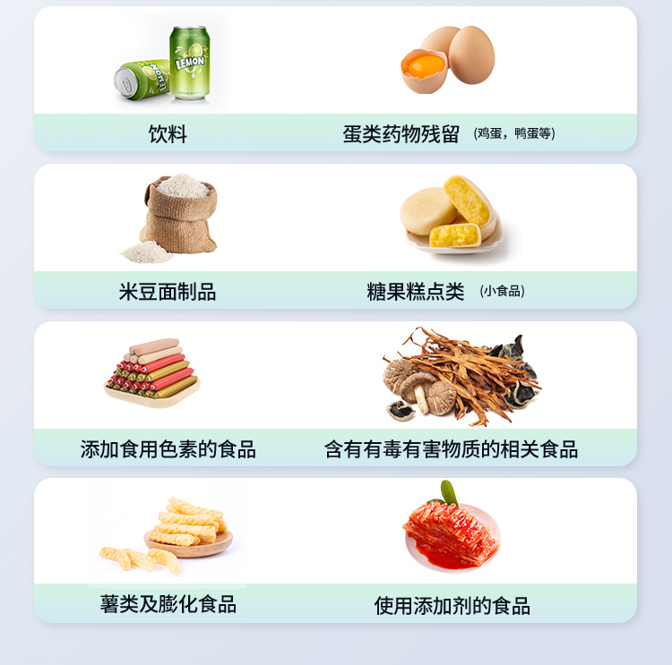 | 食品添加劑:二氧化硫、雙氧水、亞硝酸鹽、硝酸鹽、苯甲酸鈉、山梨酸鉀、糖精鈉、甜蜜素、木耳硫酸鎂等 | 有毒有害物質(zhì):甲醛、吊白塊、硼砂、過氧化苯甲酰、溴酸鉀、羅丹明B、三聚氰胺、蘇丹紅、工業(yè)堿、尿素、明礬等 | 果蔬:農(nóng)藥殘留(酶抑制率法) | 病害肉:組胺、揮發(fā)性鹽基氮 | 重金屬含量:鉛、鎘、鉻、汞、砷、錫、鎳、鋁等 | 水酒飲品分析:酒中甲醇、乙醇、乳品及牛奶中蛋白質(zhì) | 調(diào)味品成分: 食醋的總酸、醬油的總酸、芝麻油純度、谷氨酸鈉、醬油氨基酸態(tài)氮、食鹽中亞鐵氰化鉀、食鹽中碘等 | 食用色素類:紅色色素(胭脂紅、莧菜紅、莧菜紅)、黃色色素(檸檬黃、日落黃)、藍(lán)色色素(亮藍(lán))等 | 蜂蜜成分:果糖和葡萄糖、蔗糖、淀粉酶、酸度等 | 食用油脂:過氧化值、酸價等 |
