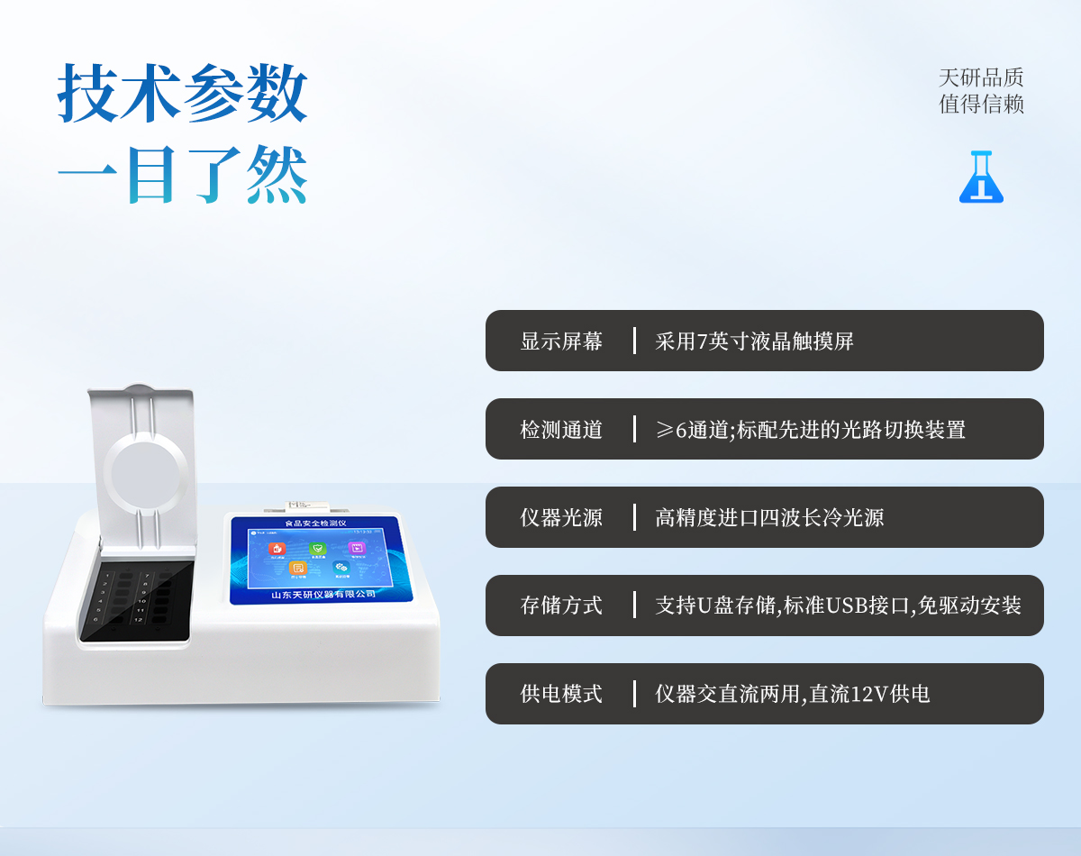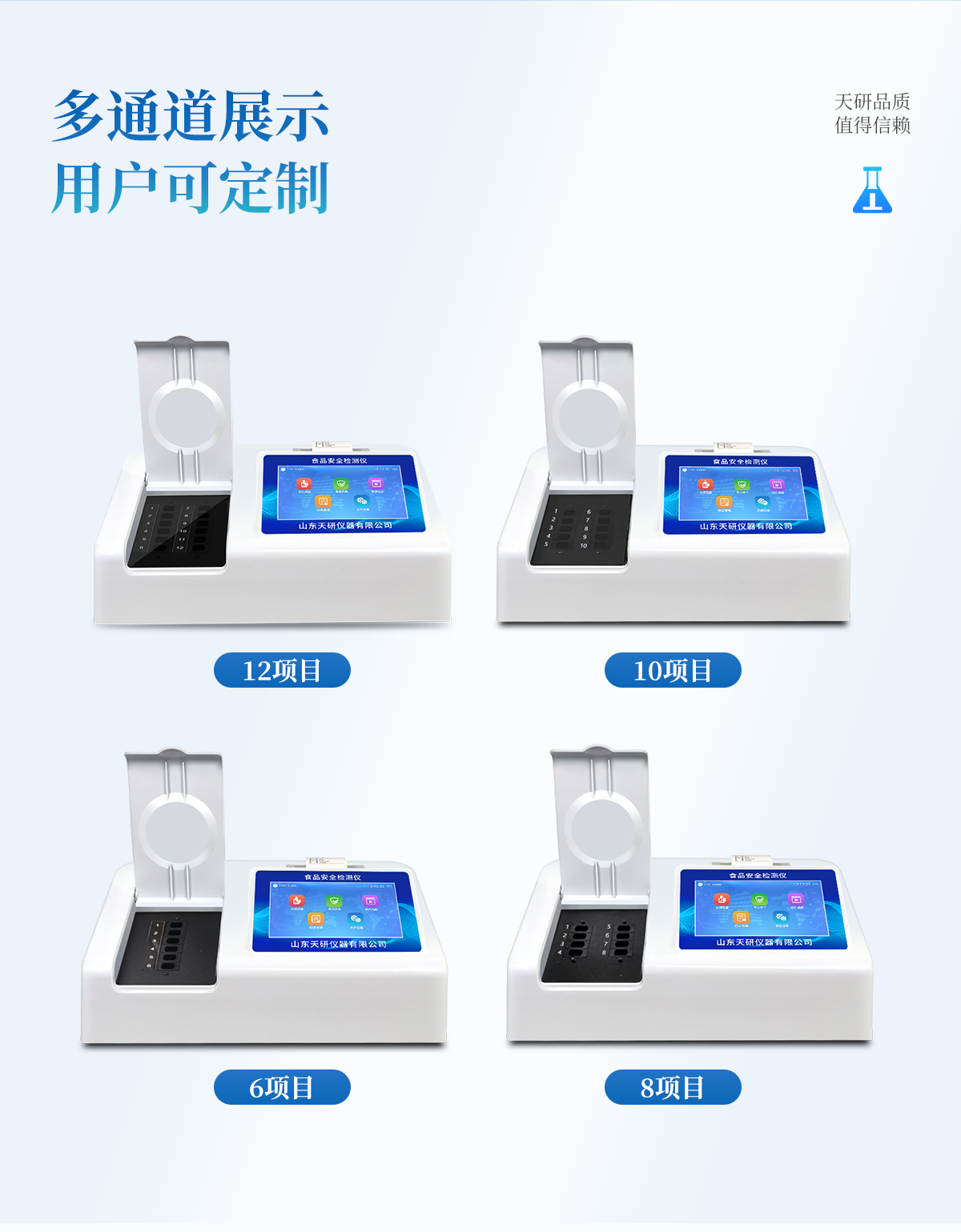 產(chǎn)品介紹: 多功能食品安全檢測儀可快速檢測200多項目,包含非食用化學(xué)物質(zhì)、濫用食品添加劑、農(nóng)藥殘留、獸藥殘留、重金屬、病害肉、營養(yǎng)強化劑、抗生素類殘留、激素類殘留、真菌毒素類殘留、化學(xué)類殘留等現(xiàn)場的定性定量檢測。該多功能食品安全檢測儀為集成化食品安全快速檢測分析設(shè)備,廣泛應(yīng)用于市場