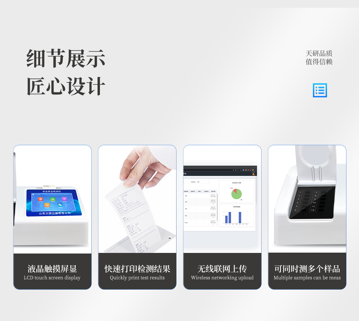 | 安卓智能操作系統(tǒng),采用更加**和人性化操作,儀器具有網(wǎng)線連接、wifi聯(lián)網(wǎng)上傳、GPRS無線遠傳功能,快速上傳數(shù)據(jù)。 | 智能化程度高,儀器具有自檢功能:具有開機自檢和調(diào)零功能,具有自動檢測重復(fù)性功能。 | 檢測通道:≥12個檢測通道,可以同時測試多個樣品,每個樣品由程序控制分別獨立工作,不會互相干擾。 | 顯示方式:≥8英寸液晶觸摸屏顯示,人性化中文操作界面,讀數(shù)直觀、簡單。 | 配備新一代嵌入式熱敏打印機,可選擇手動打印或者自動打印,檢測完成可自動打印檢測報告和二維碼。 | 光源采用進口超高亮發(fā)光二極管,高精度、穩(wěn)定性強、光源可控、可以關(guān)掉不使用的光源,功耗更低。 | 采用USB2.0接口設(shè)計,方便數(shù)據(jù)的存貯和移動,并可隨時與計算機直接相連,并且可用計算機控制儀器。實現(xiàn)數(shù)據(jù)查詢、瀏覽、分析、統(tǒng)計、打印等。 | 儀器帶有監(jiān)管平臺。數(shù)據(jù)可局域網(wǎng)和互聯(lián)網(wǎng)數(shù)據(jù)上傳,檢測結(jié)果直接傳至食品安全監(jiān)管平臺。進行區(qū)域食品安全監(jiān)管及大數(shù)據(jù)分析處理,檢測區(qū)域食品安全長短期動態(tài),達到食品安全問題預(yù)估、預(yù)警 | 一體化便攜式快檢設(shè)備,滿足現(xiàn)場及流動檢測使用需求,能夠在同一軟件下實現(xiàn)所有檢測項目的檢測,并可通過同一窗口直觀顯示檢測結(jié)果。 | 儀器具有多品類多種類樣品菜單庫,可靈活選擇檢測樣品,不同的檢測通道可同時檢測不同的樣品項目。也可在儀器上直接編輯錄入樣品名稱、檢測指標、送檢單位等信息并保存進樣品數(shù)據(jù)庫。 | 樣品處理簡單省力,整體操作快速、安全、便捷。 | 儀器具有自身保護功能,可設(shè)置用戶名及密碼,防止非工作人員操作等。 | 高靈敏度,高檢測精度,高重復(fù)性精度,掃描式高精度光學傳感器。 | 儀器具有重新校準、鎖定、恢復(fù)出廠設(shè)置功能。 | 支持U盤存儲。 結(jié)果判定線可修改,對照值標定值可保存,斷電不丟失數(shù)據(jù)。 |