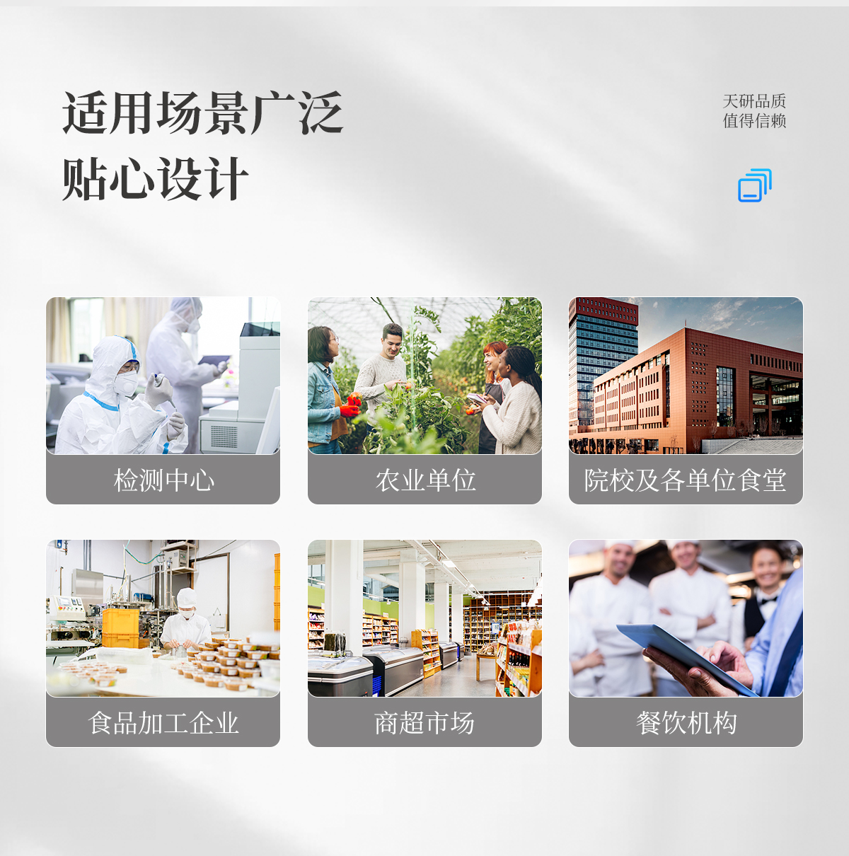 多功能食品安全檢測儀可快速檢測200多項目,包含非食用化學物質(zhì)、濫用食品添加劑、農(nóng)藥殘留、獸藥殘留、重金屬、病害肉、營養(yǎng)強化劑、抗生素類殘留、激素類殘留、真菌毒素類殘留、化學類殘留等現(xiàn)場的定性定量檢測。該多功能食品安全檢測儀為集成化食品安全快速檢測分析設(shè)備,廣泛應(yīng)用于市場監(jiān)管局、檢測中心、衛(wèi)生監(jiān)督部門、農(nóng)業(yè)部門、院校及各單位食堂、食品肉產(chǎn)品深加工企業(yè)、商超市場、司法部門、餐飲機構(gòu)、養(yǎng)殖場、屠宰場、檢驗檢疫部門等單位使用。