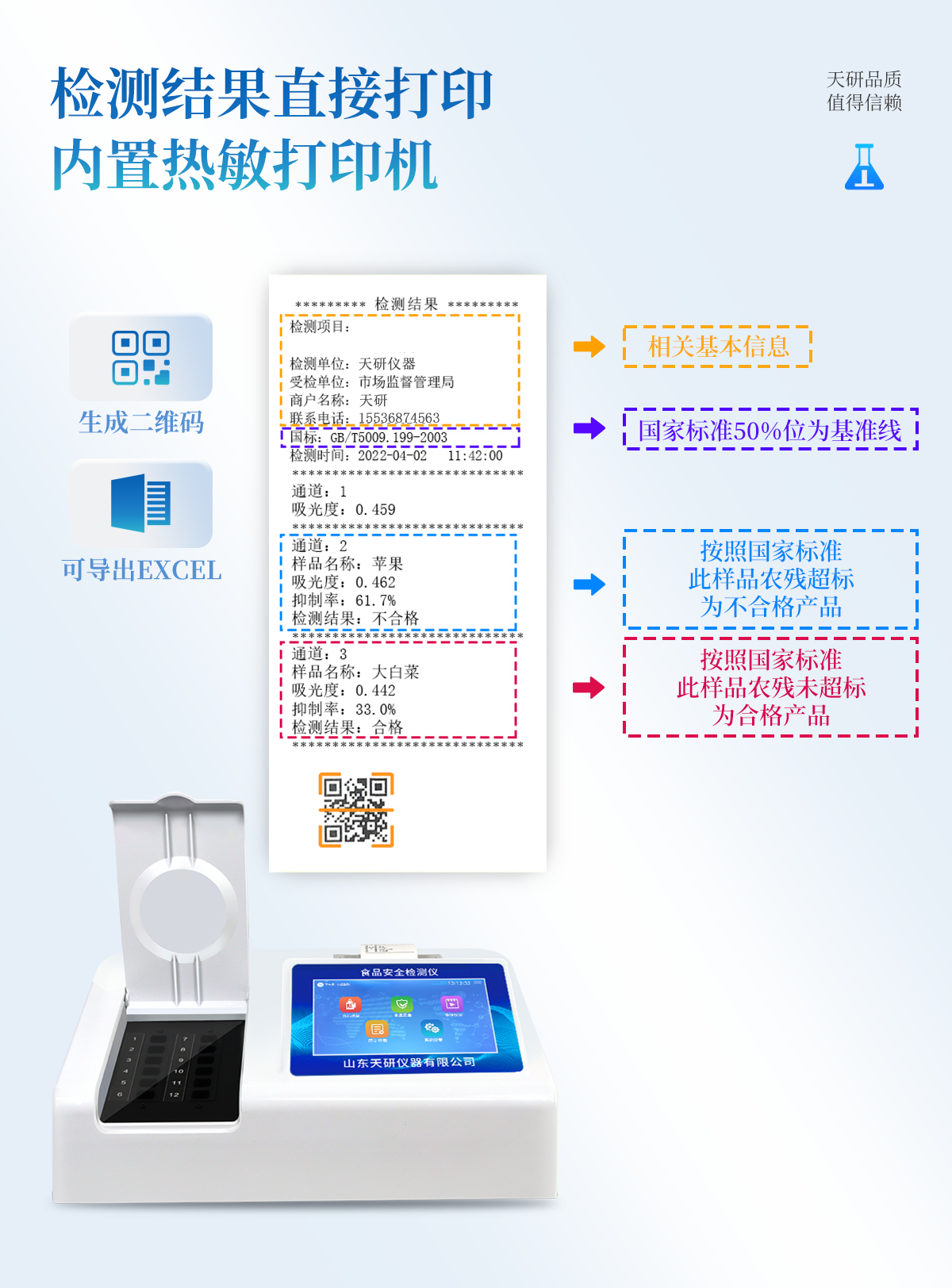 | 安卓智能操作系統(tǒng),采用更加**和人性化操作,儀器具有網(wǎng)線連接、wifi聯(lián)網(wǎng)上傳、GPRS無線遠傳功能,快速上傳數(shù)據(jù)。 | 智能化程度高,儀器具有自檢功能:具有開機自檢和調(diào)零功能,具有自動檢測重復(fù)性功能。 | 檢測通道:≥12個檢測通道,可以同時測試多個樣品,每個樣品由程序控制分別獨立工作,不會互相干擾。 | 顯示方式:≥8英寸液晶觸摸屏顯示,人性化中文操作界面,讀數(shù)直觀、簡單。 | 配備新一代嵌入式熱敏打印機,可選擇手動打印或者自動打印,檢測完成可自動打印檢測報告和二維碼。 | 光源采用進口超高亮發(fā)光二極管,高精度、穩(wěn)定性強、光源可控、可以關(guān)掉不使用的光源,功耗更低。 | 采用USB2.0接口設(shè)計,方便數(shù)據(jù)的存貯和移動,并可隨時與計算機直接相連,并且可用計算機控制儀器。實現(xiàn)數(shù)據(jù)查詢、瀏覽、分析、統(tǒng)計、打印等。 | 儀器帶有監(jiān)管平臺。數(shù)據(jù)可局域網(wǎng)和互聯(lián)網(wǎng)數(shù)據(jù)上傳,檢測結(jié)果直接傳至食品安全監(jiān)管平臺。進行區(qū)域食品安全監(jiān)管及大數(shù)據(jù)分析處理,檢測區(qū)域食品安全長短期動態(tài),達到食品安全問題預(yù)估、預(yù)警 | 一體化便攜式快檢設(shè)備,滿足現(xiàn)場及流動檢測使用需求,能夠在同一軟件下實現(xiàn)所有檢測項目的檢測,并可通過同一窗口直觀顯示檢測結(jié)果。 | 儀器具有多品類多種類樣品菜單庫,可靈活選擇檢測樣品,不同的檢測通道可同時檢測不同的樣品項目。也可在儀器上直接編輯錄入樣品名稱、檢測指標、送檢單位等信息并保存進樣品數(shù)據(jù)庫。 | 樣品處理簡單省力,整體操作快速、安全、便捷。 | 儀器具有自身保護功能,可設(shè)置用戶名及密碼,防止非工作人員操作等。 | 高靈敏度,高檢測精度,高重復(fù)性精度,掃描式高精度光學(xué)傳感器。 | 儀器具有重新校準、鎖定、恢復(fù)出廠設(shè)置功能。 | 支持U盤存儲。 結(jié)果判定線可修改,對照值標定值可保存,斷電不丟失數(shù)據(jù)。 |