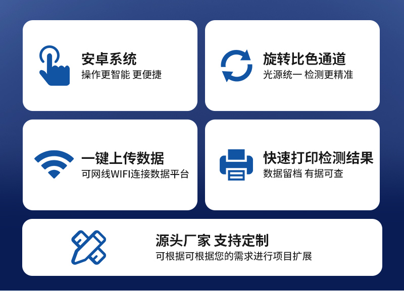 | 安卓智能操作系統(tǒng),采用更加**和人性化操作,儀器具有無線聯(lián)網(wǎng)上傳功能,快速上傳數(shù)據(jù),進(jìn)行數(shù)據(jù)統(tǒng)計(jì)和分析。 | 智能化程度高,儀器具有自檢功能:具有開機(jī)自檢和調(diào)零功能,具有自動(dòng)檢測重復(fù)性功能;同時(shí),檢測完成可自動(dòng)打印檢測報(bào)告和二維碼。手機(jī)掃碼可顯示出詳細(xì)檢測信息。 | 儀器帶有監(jiān)管平臺,數(shù)據(jù)可局域網(wǎng)和互聯(lián)網(wǎng)數(shù)據(jù)上傳,檢測結(jié)果直接傳至食品安全監(jiān)管平臺。進(jìn)行區(qū)域食品安全監(jiān)管及大數(shù)據(jù)分析處理與數(shù)據(jù)統(tǒng)計(jì),檢測區(qū)域食品安全長短期動(dòng)態(tài),達(dá)到食品安全問題預(yù)估、預(yù)警 。 | 樣品處理簡單省力,整體操作快速、安全、便捷。 | 儀器具有自身保護(hù)功能,可設(shè)置用戶名及密碼,防止非工作人員操作等。 | 內(nèi)置強(qiáng)大的數(shù)據(jù)庫,可在儀器上直接選擇樣品名稱、檢測指標(biāo)、送檢單位等信息,也可在儀器上直接編輯錄入樣品名稱、檢測指標(biāo)、送檢單位等信息并保存進(jìn)樣品數(shù)據(jù)庫,方便后期操作調(diào)取使用。 | 儀器具有重新校準(zhǔn)、鎖定、恢復(fù)出廠設(shè)置功能。 |