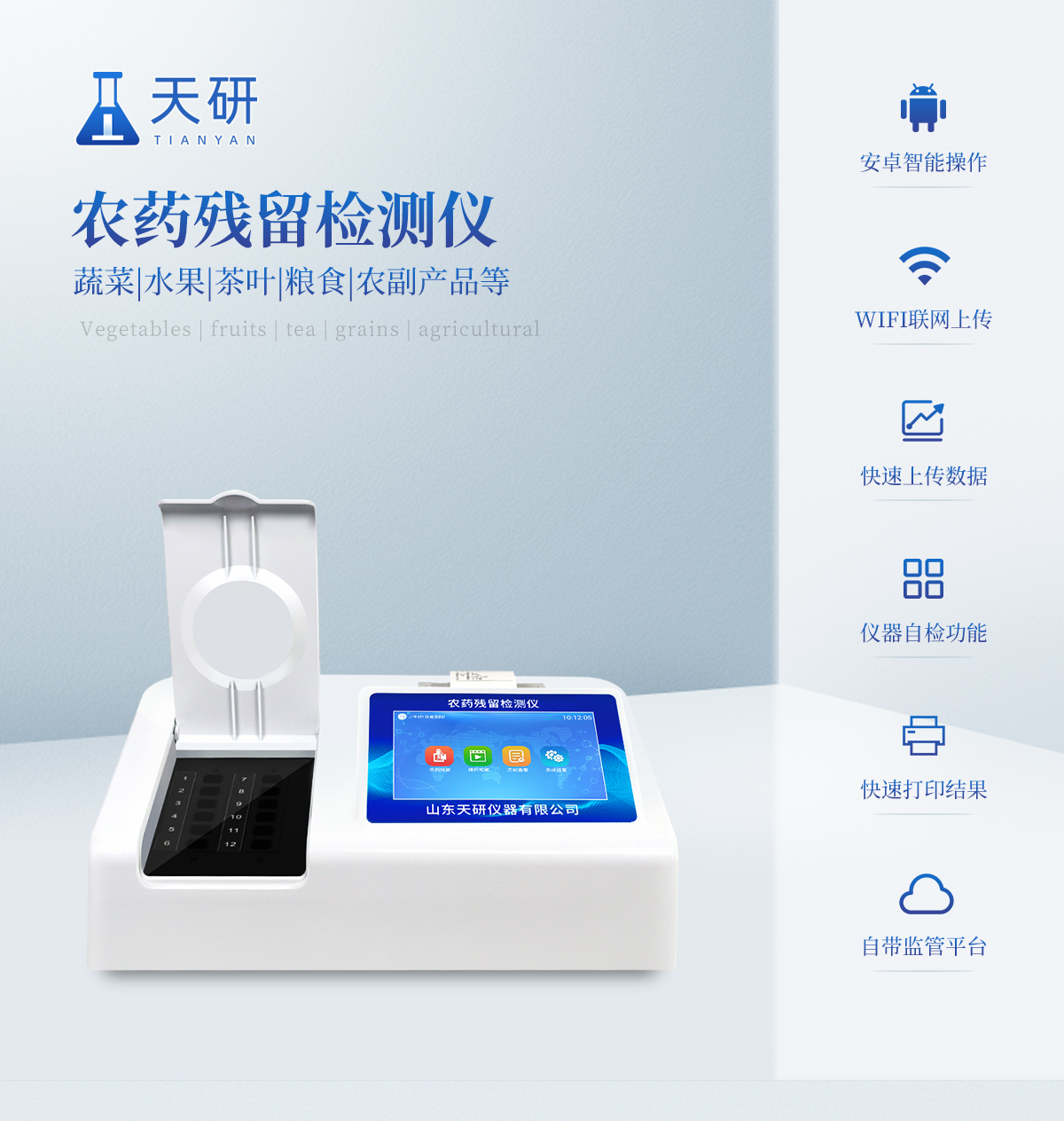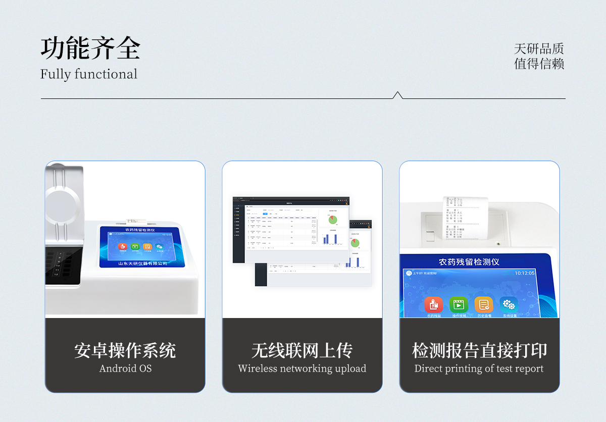 | 乙酰膽堿酯酶和丁酰膽堿酯酶試劑均可以使用,符合國(guó)家標(biāo)準(zhǔn)和農(nóng)業(yè)部標(biāo)準(zhǔn)的要求。 | 自動(dòng)判斷樣品是否合格,檢測(cè)結(jié)果更加直觀。 | 儀器具有100多種蔬菜名稱菜單庫,分類管理,并可按需添加或刪除蔬菜名,編輯蔬菜名稱,可直接打印出蔬菜名稱。 | 檢測(cè)通道:12個(gè)檢測(cè)通道,可以同時(shí)測(cè)試多個(gè)樣品,循環(huán)檢測(cè),即放即檢,每個(gè)樣品由程序控制分別獨(dú)立工作,不會(huì)互相干擾。 | 智能操作系統(tǒng),采用更加人性化操作,主控采用多核處理器,主頻1.88Ghz,運(yùn)轉(zhuǎn)速度更快速,穩(wěn)定性更強(qiáng)。 | 顯示方式:7英寸高靈敏真彩觸摸屏顯示,人性化中文操作界面,讀數(shù)直觀、簡(jiǎn)單。 | 打印機(jī)采用串口5v打印,可選擇手動(dòng)打印或者自動(dòng)打印,三分鐘出打印結(jié)果,打印格式為檢測(cè)人姓名、吸光度差值、檢測(cè)時(shí)間、檢測(cè)機(jī)構(gòu)、樣品名稱及結(jié)果判定。 | 光源采用進(jìn)口超高亮發(fā)光二極管,具有低功耗、高精度、穩(wěn)定性強(qiáng)、光源可控可以關(guān)掉不使用的光源,響應(yīng)速度快等優(yōu)點(diǎn)。 | 智能恒流穩(wěn)壓,光強(qiáng)自動(dòng)校準(zhǔn),長(zhǎng)時(shí)間連續(xù)工作光源無溫漂現(xiàn)象。 | 儀器具有GPRS遠(yuǎn)傳功能,可插手機(jī)卡實(shí)現(xiàn)數(shù)據(jù)遠(yuǎn)傳平臺(tái),wifi聯(lián)網(wǎng)功能,可將數(shù)據(jù)快速上傳電腦,進(jìn)行數(shù)據(jù)管理與統(tǒng)計(jì)。 | 采用USB2.0接口設(shè)計(jì),方便數(shù)據(jù)的存貯和移動(dòng),并可隨時(shí)與計(jì)算機(jī)直接相連,并且可用計(jì)算機(jī)控制儀器。實(shí)現(xiàn)數(shù)據(jù)查詢、瀏覽、分析、統(tǒng)計(jì)、打印等。 | 智能化程度高,儀器具有自檢功能:具有開機(jī)自檢和調(diào)零功能,具有自動(dòng)檢測(cè)重復(fù)性功能 | 儀器具有自身保護(hù)功能,可設(shè)置用戶名及密碼,防止非工作人員操作等。 | 采用DC12v直流供電,安全系統(tǒng)更高,并且配備6A鋰電池充電器。 | 儀器具有重新校準(zhǔn)、鎖定、恢復(fù)出廠設(shè)置功能。 |