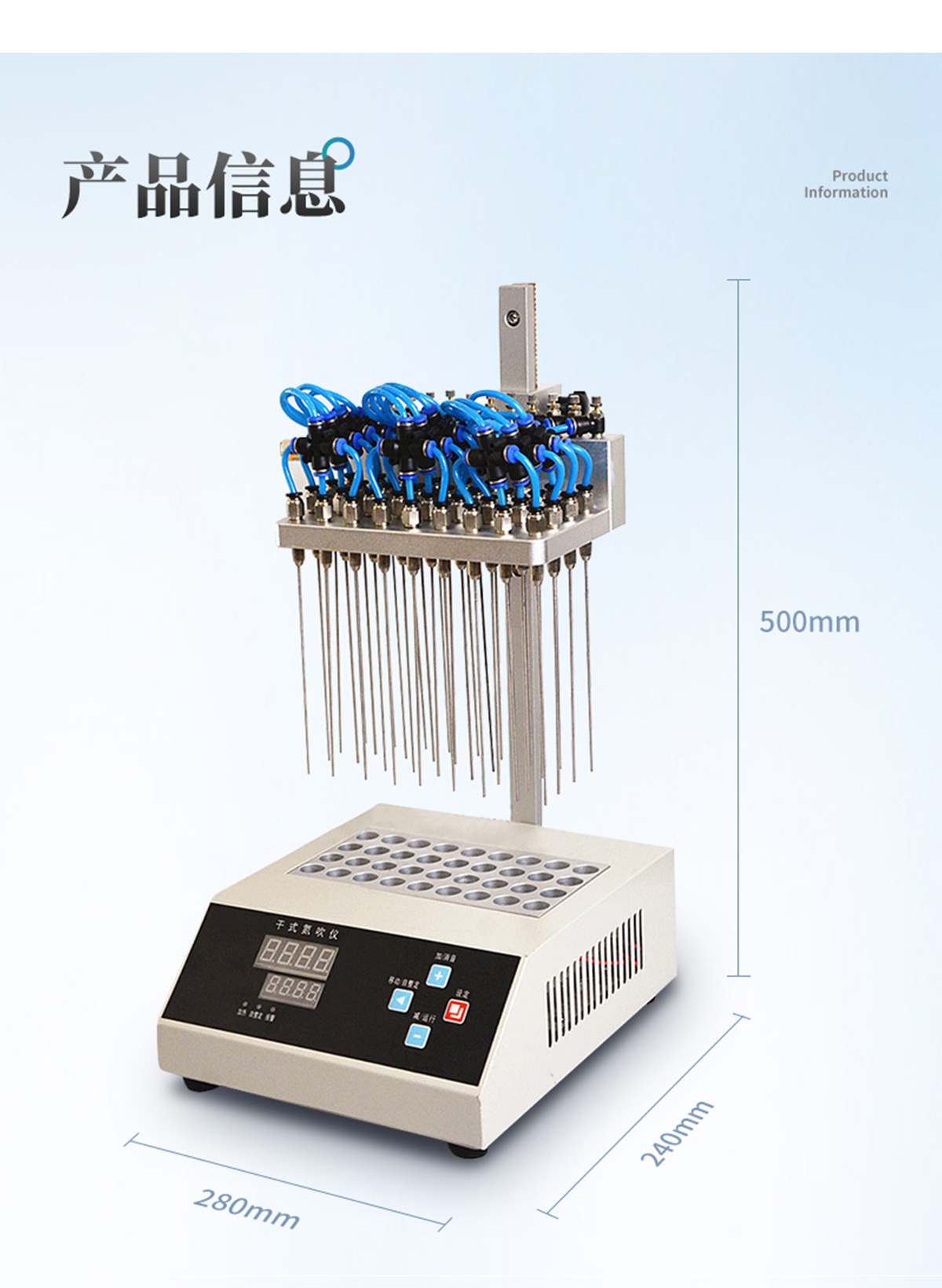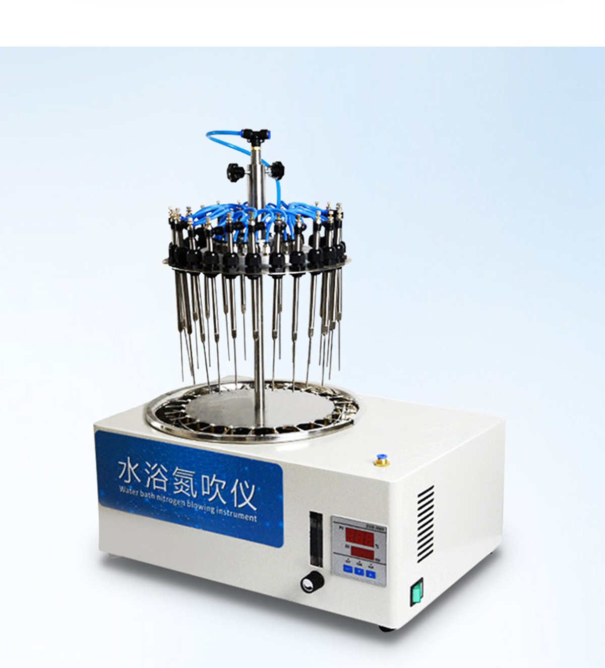 | 每個(gè)吹針都可以獨(dú)立控制,避免引起交叉污染。 | 儀器氣腔高度可以自行調(diào)節(jié),配備標(biāo)準(zhǔn)氣針長度為15厘米。 | 氮吹儀有36個(gè)氣道控制開關(guān),節(jié)約氣體,每根吹氣針的位置可獨(dú)立改變吹掃位置,使之適用不同的樣品容器及不同的樣品位置 | 在濃縮有毒溶劑時(shí),整個(gè)系統(tǒng)可置于通風(fēng)柜中,降低危險(xiǎn)。 | 內(nèi)置超溫保護(hù)裝置,自動故障檢測及報(bào)警功能,方便實(shí)用。 | 儀器有LED顯示屏,溫度同步顯示、時(shí)間遞減顯示,可時(shí)時(shí)觀察溫度變化。 | 具有整體溫度更均勻,加熱速度快 | 本產(chǎn)品還可以作為普通的干式恒溫器使用 | 使用起來更簡便,而且溫度也可以達(dá)到150℃,可以更好濃縮樣品 |