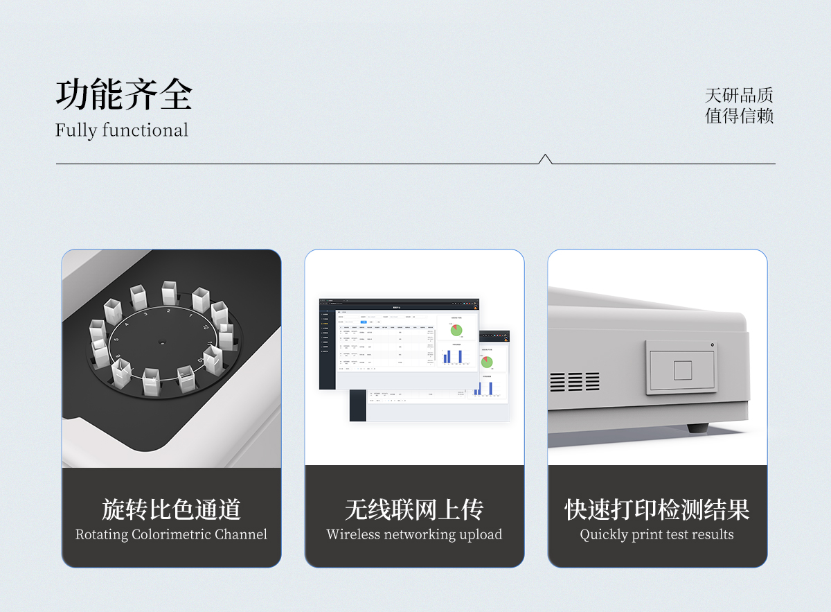| 1、智能**且方便 | ①智能芯片:主控芯片采用ARM Cortex-A7,RK3288/4核處理器,搭配安卓智能操作系統(tǒng),集實(shí)驗(yàn)操作,分析結(jié)果,打印報(bào)告等功能于一體,使用方便,性能更強(qiáng)。 | ②大屏顯示:采用10.1英寸液晶觸摸屏,單機(jī)即可操作,無(wú)需連接外部顯示或控制器。 | ③多樣同檢:儀器具有12個(gè)檢測(cè)通道,可同時(shí)一次性檢測(cè)11個(gè)樣品,效率更高。 | ④工作預(yù)設(shè):具有任務(wù)預(yù)設(shè)模塊,一鍵提前預(yù)設(shè)樣品所有信息內(nèi)容。來(lái)樣時(shí)可直接檢測(cè),同時(shí)可多次調(diào)取。 | ⑤數(shù)據(jù)分析:設(shè)備首頁(yè)自動(dòng)匯總分析數(shù)據(jù),并繪制柱形分析圖,各項(xiàng)檢測(cè)數(shù)據(jù)一目了然,快捷直觀。 | ⑥高度集成:模塊高度集合,將分光光度模塊、數(shù)字化管理模塊、無(wú)線通訊模塊集成于一體??蓪z測(cè)結(jié)果進(jìn)行分析,直接上傳至數(shù)據(jù)平臺(tái),實(shí)現(xiàn)數(shù)據(jù)共享,方便后期進(jìn)行數(shù)據(jù)分析與統(tǒng)計(jì)。 | ⑦遠(yuǎn)程升級(jí):儀器具備遠(yuǎn)程升級(jí)功能,可遠(yuǎn)程升級(jí)程序,無(wú)需返廠,并可持續(xù)性免費(fèi)更新系統(tǒng)版本,降低成本及運(yùn)輸損耗風(fēng)險(xiǎn)。 | 2、檢測(cè)精準(zhǔn)且直觀 | ①專(zhuān)利技術(shù):精密旋轉(zhuǎn)比色池,使用同芯片同光源校準(zhǔn)精度,解決不同光源之間存在波長(zhǎng)誤差的問(wèn)題,更加準(zhǔn)確**。 | ②結(jié)果直觀:儀器自動(dòng)對(duì)檢測(cè)結(jié)果與國(guó)標(biāo)限量值進(jìn)行對(duì)比,自動(dòng)判定結(jié)果是否合格,結(jié)果更直觀。 | 3、功能強(qiáng)大且實(shí)用 | ①存儲(chǔ)功能:設(shè)備可以存儲(chǔ)數(shù)據(jù)100000組,可在屏幕上直觀查看歷史數(shù)據(jù),可導(dǎo)出數(shù)據(jù)。 | ②打印功能:設(shè)備自帶打印功能,可對(duì)樣品信息及檢測(cè)結(jié)果無(wú)限次隨意打印。 | ③全新方式:新創(chuàng)自定義打印方式,可按需靈活勾選控制:二維碼,抽樣信息、檢測(cè)信息,受檢信息、復(fù)核信息、抽樣日期、檢測(cè)日期等信息的打印 | ④多重編輯:樣品信息可多重編輯,可以對(duì)每個(gè)通道屬性和樣品信息單獨(dú)進(jìn)行編輯,例如樣品信息、抽樣信息、檢測(cè)信息,受檢信息、復(fù)核信息、抽樣日期、檢測(cè)日期等信息等。 | ⑤雙語(yǔ)設(shè)計(jì):全中文/英文操作菜單,簡(jiǎn)單實(shí)用,適用于不同用戶(hù)的需求。 |