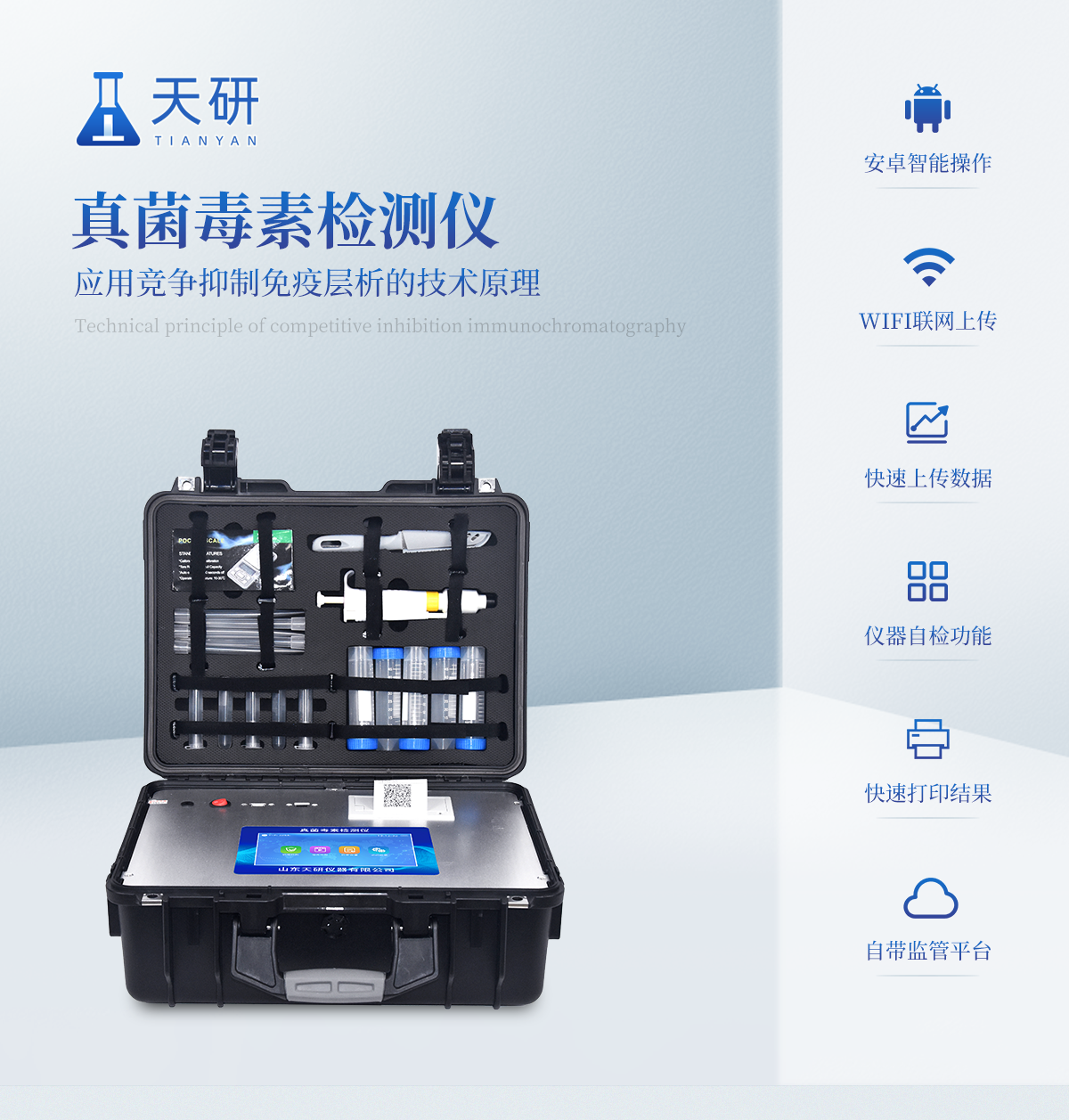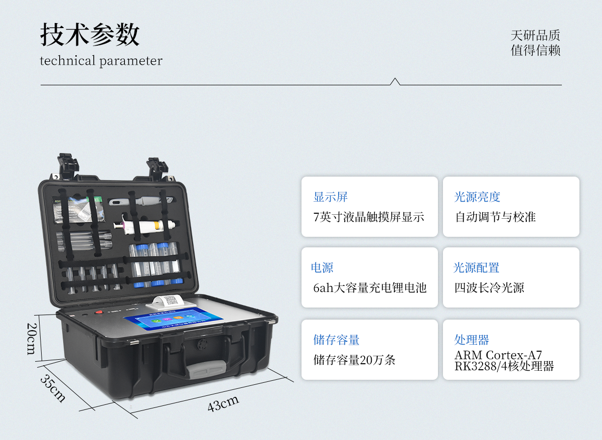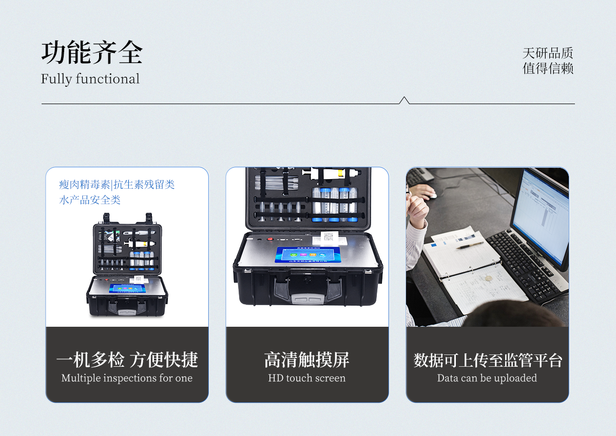 | 用途:可用于糧食谷物及其制品、飼料、植物油中真菌毒素快速定量測定; | 檢測方法:采用發(fā)光定量免疫層析技術(shù),激光激發(fā),掃描方式收集發(fā)光熒光信號。 | 定量參數(shù)設(shè)定:RFID芯片記錄檢測目標(biāo)的標(biāo)準(zhǔn)曲線,根據(jù)不同樣本類型配備多參數(shù)卡; | 識別功能:試劑插卡后儀器自動識別檢測項目; | 靈敏性和特異性:不受外界的背景干擾, 檢測限為0.4-4500ug/kg;對其它毒素?zé)o非特異反應(yīng); | 穩(wěn)定性:無淬滅和光漂白現(xiàn)象; | 檢測時間快,實時顯示檢測曲線 | 無需孵育器,室溫(15-30℃)下進行測試 | 數(shù)據(jù)獲取和處理:檢測結(jié)果自動獲?。o需目測),可實時打印檢測報告;數(shù)據(jù)可儲存,可導(dǎo)出。 | 儀器可靠:有開機系統(tǒng)自檢功能;儀器配有質(zhì)控卡,確保檢測系統(tǒng)自身的準(zhǔn)確性; | 檢測數(shù)據(jù)精準(zhǔn)可靠:HPLC/LC-MS結(jié)果接近 | 檢測儀器獲得國家認(rèn)證 | 聯(lián)網(wǎng):網(wǎng)絡(luò)接口 | 升級:可以通過U盤進行軟件升級 | 存儲空間:≥32G,最大擴展至64G | 工作功率:40W | 操作系統(tǒng):windows 7 | 顯示屏:可觸摸顯示屏,屏幕尺寸≥8寸 | 定量檢測項目:包括黃曲霉毒素B1、嘔吐毒素、玉米赤霉烯酮、T-2毒素、伏馬毒素 |