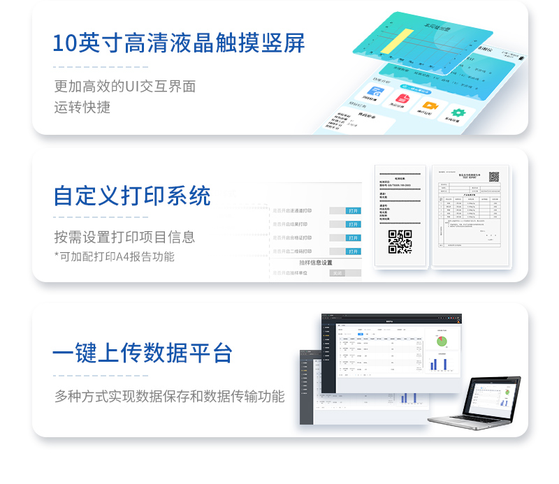 | 安卓智能操作系統(tǒng),采用更加**和人性化操作,儀器具有無線聯(lián)網(wǎng)上傳功能,快速上傳數(shù)據(jù),進(jìn)行數(shù)據(jù)統(tǒng)計(jì)和分析。 | 智能化程度高,儀器具有自檢功能:具有開機(jī)自檢和調(diào)零功能,具有自動(dòng)檢測(cè)重復(fù)性功能;同時(shí),檢測(cè)完成可自動(dòng)打印檢測(cè)報(bào)告和二維碼。手機(jī)掃碼可顯示出詳細(xì)檢測(cè)信息。 | 儀器帶有監(jiān)管平臺(tái),數(shù)據(jù)可局域網(wǎng)和互聯(lián)網(wǎng)數(shù)據(jù)上傳,檢測(cè)結(jié)果直接傳至食品安全監(jiān)管平臺(tái)。進(jìn)行區(qū)域食品安全監(jiān)管及大數(shù)據(jù)分析處理與數(shù)據(jù)統(tǒng)計(jì),檢測(cè)區(qū)域食品安全長短期動(dòng)態(tài),達(dá)到食品安全問題預(yù)估、預(yù)警 。 | 樣品處理簡單省力,整體操作快速、安全、便捷。 | 儀器具有自身保護(hù)功能,可設(shè)置用戶名及密碼,防止非工作人員操作等。 | 內(nèi)置強(qiáng)大的數(shù)據(jù)庫,可在儀器上直接選擇樣品名稱、檢測(cè)指標(biāo)、送檢單位等信息,也可在儀器上直接編輯錄入樣品名稱、檢測(cè)指標(biāo)、送檢單位等信息并保存進(jìn)樣品數(shù)據(jù)庫,方便后期操作調(diào)取使用。 | 儀器具有重新校準(zhǔn)、鎖定、恢復(fù)出廠設(shè)置功能。 |