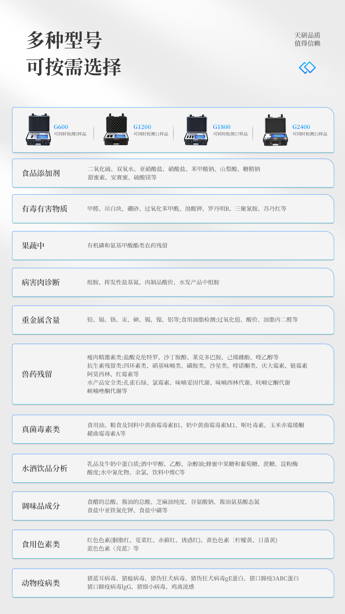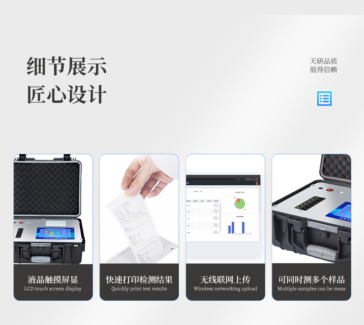 | 儀器采用手提式一體化系統(tǒng)檢測技術(shù),將分光光度模塊、新型農(nóng)殘檢測模塊、數(shù)字化管理模塊、無線通訊模塊高度集成于一體,支持檢測200種食品安全檢測項目,同時預(yù)留升級檢測方法。 | 儀器檢測模塊標(biāo)準(zhǔn)化、智能化,檢測項目可隨意自由組合。檢測箱體內(nèi)置多個標(biāo)準(zhǔn)檢測單元,檢測模塊可以調(diào)整配置。 | 顯示屏幕:儀器采用10.1英寸豎向液晶觸摸屏顯,搭配運行安卓智能操作系統(tǒng),主控芯片采用ARM Cortex-A7,RK3288/4核處理器,主頻1.88Ghz,操作方便,性能更強。 | 檢測通道:≥12通道;采用精密旋轉(zhuǎn)比色池設(shè)計,使用同芯片同光源校準(zhǔn)精度,解決不同光源之間的誤差值,更加準(zhǔn)確**。(1-12通道間誤差0.1%,專利號:ZL202022821055.2) | 儀器光源:高精度進口四波長冷光源,每個通道均配置 410、520、590、630nm 波長光源,標(biāo)配**的光路切換裝置,專利光路切換功能可實現(xiàn)64波長,并且所有檢測項目可實現(xiàn)所有通道同時檢測。 | 設(shè)備可一鍵校準(zhǔn),自動保存校準(zhǔn)數(shù)據(jù),自動對比校驗,得到精準(zhǔn)光源,采用Android SP存儲數(shù)據(jù),光源數(shù)據(jù)永不丟失,方便每一次使用。 | 通訊接口:配備無線通信模塊、4G(APN)通訊模塊、藍牙傳輸,同時具有雙USB接口以及RJ45網(wǎng)線接口,可以多方式實現(xiàn)數(shù)據(jù)保存及數(shù)據(jù)傳輸 | 存儲方式:支持U盤存儲,標(biāo)準(zhǔn)USB接口,免驅(qū)動安裝。檢測結(jié)果存儲容量20萬條以上,可生成Excel表格進行拷貝,并具有登錄保護功能。 | 智能化操作系統(tǒng): | 1)操作系統(tǒng):儀器可在同一檢測界面自動對應(yīng)相關(guān)檢測通道,一次性選擇1-12個樣品名稱,無需退出界面,節(jié)省操作時間。并可以對每個通道屬性和樣品信息單獨進行編輯,例如送檢單位、人員,檢測人員等,打印時勾選打印顯示。 | 2)數(shù)據(jù)集成系統(tǒng):設(shè)備首頁自動匯總分析檢測數(shù)據(jù),包含:周檢測數(shù)據(jù)、月檢測數(shù)據(jù),全部檢測總數(shù)量,均包含檢測總數(shù),合格數(shù),不合格數(shù),以及相關(guān)柱形分析圖,各項檢測數(shù)據(jù)一目了然,無需電腦查詢,更加快捷直觀。 | 3)數(shù)據(jù)庫系統(tǒng):十幾項數(shù)據(jù)庫分類管理儀器:包含項目類型、項目數(shù)據(jù)、檢測數(shù)據(jù)、歷史記錄、國標(biāo)信息、曲線信息、采樣信息、檢測信息、受檢信息、復(fù)核信息、圖表信息、光源校準(zhǔn)信息、打印樣式信息、樣品庫信息等等,數(shù)據(jù)庫之間互相協(xié)調(diào)聯(lián)動保證數(shù)據(jù)的真實完整性。同時產(chǎn)品數(shù)據(jù)庫以及歷史檢測記錄支持一鍵檢索功能。 | 4)限量規(guī)判系統(tǒng):具有限量查詢、添加物質(zhì)合規(guī)判定系統(tǒng)。檢測出結(jié)果后,系統(tǒng)自動調(diào)用系統(tǒng)數(shù)據(jù)庫中相關(guān)國標(biāo)進行比對判定,客觀顯示判定結(jié)果是否合格。 | 5)項目預(yù)設(shè)系統(tǒng):儀器具有任務(wù)預(yù)設(shè)模塊,一鍵提前預(yù)設(shè),給出方便快捷的新檢測方案,每一個任務(wù)分別可以設(shè)置不同的樣品、批次、編號、來源、備注、抽樣信息、檢測信息、受檢信息、復(fù)核信息等更多信息。樣品送檢時一鍵調(diào)取保存信息,并可多次調(diào)取,大大提高檢測效率。 | 6)數(shù)據(jù)監(jiān)管系統(tǒng):同步對接監(jiān)管平臺,數(shù)據(jù)可局域網(wǎng)和互聯(lián)網(wǎng)數(shù)據(jù)上傳,檢測結(jié)果可選擇直接傳至食品安全監(jiān)管平臺。進行區(qū)域食品安全監(jiān)管及大數(shù)據(jù)分析處理與數(shù)據(jù)統(tǒng)計,檢測區(qū)域食品安全長短期動態(tài),達到食品安全問題預(yù)估、預(yù)警。 | 7)打印系統(tǒng):內(nèi)置全新打印機,新創(chuàng)自定義打印方式,可按需靈活勾選控制:產(chǎn)品合格證(國家農(nóng)業(yè)部標(biāo)準(zhǔn)要求),二維碼,抽樣信息、檢測信息,受檢信息、復(fù)核信息、抽樣日期、檢測日期等信息的打印。 | 供電模式:儀器交直流兩用,直流12V供電,可連接車載電源,可配6ah大容量充電鋰電池,電量可實時顯示,方便戶外流動測試。 | 膠體金檢測模塊:采用雙通道CMOS成像處理技術(shù)及膠體金免疫層析技術(shù),可同時讀取雙膠體金卡數(shù)據(jù),自動采集、處理分析,將檢測結(jié)果顯示,并可根據(jù)參考限值自動判斷檢測結(jié)果,可檢測常見的獸藥殘留、生物毒素、抗生素、違禁添加物等。 | 1)探測技術(shù):CMOS成像探測; | 2)檢測通道:1個通道; | 3)檢測方式:消線法和比色法; | 4)顯示模式:陰性或陽性; | 5)曲線形式:軌道式掃描方式,顯示金標(biāo)卡圖像,實時生成、識別CT曲線圖,無需手動調(diào)整,完成檢測后自動退出檢測卡。兼容市場上其他金標(biāo)卡,使用耗材不受限制。 | 儀器加入遠程升級功能,可定向分客戶分儀器更新,開機后自動更新,客戶無需任何操作,即可升級全新項目。做到了無需退換機器即可實現(xiàn)實時遠程升級檢測儀器。 |