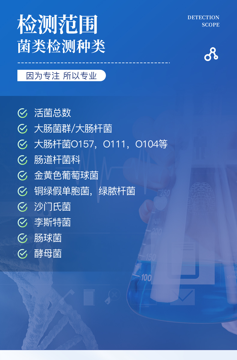 | 活細(xì)菌總數(shù) :大腸菌群/糞大腸菌群/大腸桿菌/大腸桿菌O157, O111, O104...等 | 腸道桿菌科 :金黃色葡萄球菌 銅綠假單胞菌;綠膿桿菌 沙門(mén)氏菌 李斯特菌 腸球菌 酵母菌 |