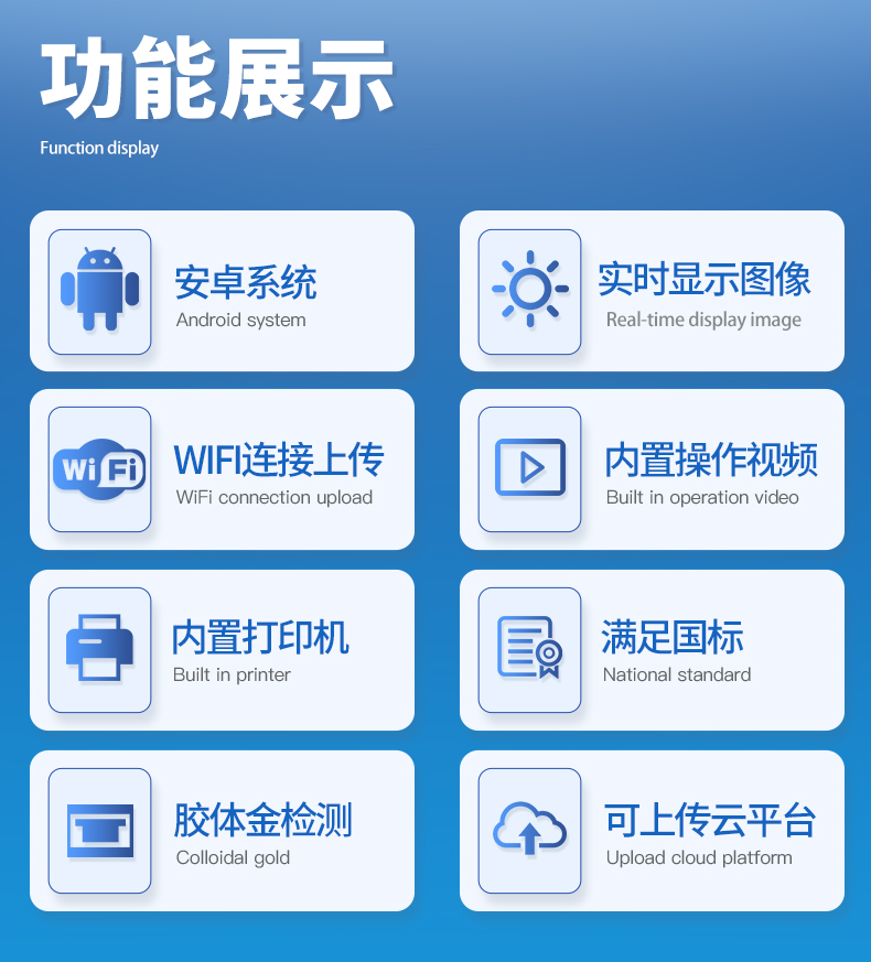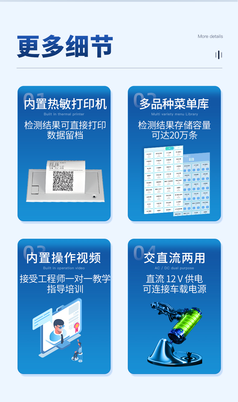 | 儀器采用10.1英寸液晶觸摸屏顯,搭配運行安卓智能操作系統(tǒng),主控芯片采用ARM Cortex-A7,RK3288/4核處理器,主頻1.88Ghz,運轉(zhuǎn)速度更快速,性能更強。 | 儀器功能包括:膠體金檢測模塊、數(shù)字化管理模塊、無線通訊模塊等,可以滿足同一軟件下實現(xiàn)所有檢測項目的檢測,并在同一窗口展示檢測結(jié)果。 | 一體化便攜式快檢設(shè)備,采用交直流兩用供電方式,可連接車載電源,配備6ah大容量充電鋰電池,可以滿足現(xiàn)場及流動檢測使用的需求。儀器尺寸:43×35×20cm, 主機凈重:5.1kg | 系統(tǒng)自帶數(shù)據(jù)集成模塊,設(shè)備首頁自動統(tǒng)計檢測數(shù)據(jù)包含:周檢測數(shù)據(jù)、月檢測數(shù)據(jù),全部檢測總數(shù)量,均包含檢測總數(shù),合格數(shù),不合格數(shù),以及相關(guān)柱形分析圖,對各項檢測數(shù)據(jù)清晰掌握,無需電腦查詢,更加快捷直觀。 | 儀器具有任務(wù)預(yù)設(shè)模塊,可在樣品送檢前提前預(yù)設(shè)樣品名稱、檢測指標(biāo)、送檢單位等信息,樣品送檢時一鍵調(diào)取保存信息,檢測更加方便快捷。 | 膠體金檢測模塊:軌道式自動傳輸掃描方式,可實時顯示金標(biāo)卡實時圖像,系統(tǒng)自動分析并呈現(xiàn)出CT曲線圖,CT線自動識別,無需手動調(diào)整,完成檢測后自動退出檢測卡。 結(jié)果判定線可修改,對照值標(biāo)定值可保存,斷電不丟失數(shù)據(jù)。 兼容市場上其他膠體金卡,使用耗材不受限制,極大增強用戶使用體驗。 | 儀器檢測系統(tǒng)擁有龐大數(shù)據(jù)庫,并且構(gòu)建了完善的檢索、修訂功能。食品庫涵蓋多種樣品名稱,可按需添加或刪除、編輯樣品名稱;產(chǎn)品數(shù)據(jù)庫以及歷史檢測記錄支持一鍵檢索功能。 | 系統(tǒng)打印自定義化,打印格式多樣化,產(chǎn)品合格證(國家標(biāo)準(zhǔn)要求),二維碼,抽樣信息、檢測信息,受檢信息、復(fù)核信息、抽樣日期、檢測日期等信息結(jié)果,可按需求自行設(shè)置打印內(nèi)容。 | A4紙版本報告打印功能(可選配):設(shè)備擁有兩種結(jié)果展示方式,可以自動生成A4打印模板和小票打印模板兩種樣式,可通過WiFi及網(wǎng)線等方式鏈接外置打印機可進行打印 | 儀器具有 wifi 聯(lián)網(wǎng)上傳、RJ45網(wǎng)線連接功能,可以快速上傳數(shù)據(jù)。同步對接監(jiān)管平臺,數(shù)據(jù)可局域網(wǎng)和互聯(lián)網(wǎng)數(shù)據(jù)上傳,檢測結(jié)果直接傳至食品安全監(jiān)管平臺。進行區(qū)域食品安全監(jiān)管及大數(shù)據(jù)分析處理與數(shù)據(jù)統(tǒng)計,檢測區(qū)域食品安全長短期動態(tài),達到食品安全問題預(yù)估、預(yù)警。 | 設(shè)備支持U盤存儲,標(biāo)準(zhǔn)USB接口,免驅(qū)動安裝。檢測結(jié)果存儲容量20萬條以上,可生成Excel表格,進行一鍵拷貝,并具有登錄保護功能,可設(shè)置用戶名及密碼,規(guī)范不同人員操作權(quán)限,防止非工作人員操作,并且可以進行重新校準(zhǔn)、鎖定、恢復(fù)出廠設(shè)置功能。儀器固件可升級,后期檢測項目可擴充。 | 儀器具備遠程升級功能,可定向分客戶分儀器更新,開機后自動更新,并可持續(xù)性免費更新系統(tǒng)版本,無需像傳統(tǒng)產(chǎn)品返廠更新,節(jié)省時間及人力成本并避免了物流運輸返廠升級導(dǎo)致設(shè)備損壞的潛在風(fēng)險。 |