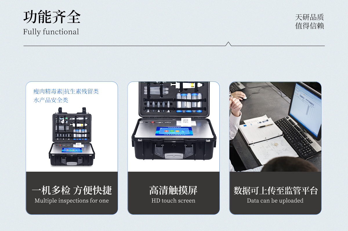 | 安卓智能操作系統(tǒng),采用更加**和人性化操作,儀器具有網(wǎng)線連接、wifi聯(lián)網(wǎng)上傳、4G無線遠(yuǎn)傳功能,快速上傳數(shù)據(jù)。 | 智能化程度高,儀器具有自檢功能:具有開機(jī)自檢和調(diào)零功能,具有自動檢測重復(fù)性功能。 | 新一代高速熱敏打印機(jī),檢測完成可自動打印檢測報告和二維碼。 | 儀器帶有監(jiān)管平臺。數(shù)據(jù)可局域網(wǎng)和互聯(lián)網(wǎng)數(shù)據(jù)上傳,檢測結(jié)果直接傳至食品安全監(jiān)管平臺。進(jìn)行區(qū)域食品安全監(jiān)管及大數(shù)據(jù)分析處理與數(shù)據(jù)統(tǒng)計,檢測區(qū)域食品安全長短期動態(tài),達(dá)到食品安全問題預(yù)估、預(yù)警。 | 一體化便攜式快檢設(shè)備,滿足現(xiàn)場及流動檢測使用需求,能夠在同一軟件下實(shí)現(xiàn)所有檢測項(xiàng)目的檢測,并可通過同一窗口直觀顯示檢測結(jié)果。 | 膠體金模塊檢測方式:軌道式自動傳輸掃描,檢測完成后自動退出檢測卡。 | CT線自動識別,無需手動調(diào)整。 | 儀器具有品類多種類樣品菜單庫,可靈活選擇檢測樣品,不同的檢測通道可同時檢測不同的樣品項(xiàng)目。 | 樣品處理簡單省力,整體操作快速、安全、便捷。 | 儀器具有自身保護(hù)功能,可設(shè)置用戶名及密碼,防止非工作人員操作等。 | 高靈敏度,高檢測精度,高重復(fù)性精度,掃描式高精度光學(xué)傳感器。 | 內(nèi)置強(qiáng)大的數(shù)據(jù)庫,可在儀器上直接選擇樣品名稱、檢測指標(biāo)、送檢單位等信息,也可在儀器上直接編輯錄入樣品名稱、檢測指標(biāo)、送檢單位等信息并保存進(jìn)樣品數(shù)據(jù)庫。 | 儀器具有重新校準(zhǔn)、鎖定、恢復(fù)出廠設(shè)置功能。 | 支持U盤存儲。 結(jié)果判定線可修改,對照值標(biāo)定值可保存,斷電不丟失數(shù)據(jù)。 | 兼容市場上所有的膠體金卡,使用耗材不受限制,極大增強(qiáng)用戶使用體驗(yàn)。 |