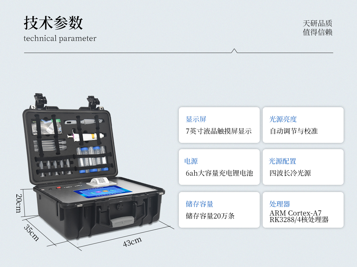 | 主控芯片采用ARM Cortex-A7,RK3288/4核處理器,主頻1.88Ghz,運(yùn)轉(zhuǎn)速度更快速,穩(wěn)定性更強(qiáng)。 | 顯示方式:7英寸液晶觸摸屏顯示,人性化中文操作界面,讀數(shù)直觀、簡單。 | 交直流兩用,直流12V供電,可連接車載電源,可配6ah大容量充電鋰電池,方便戶外流動測試。 | 光源亮度自動調(diào)節(jié)與校準(zhǔn) | 智能恒流穩(wěn)壓,光強(qiáng)自動校準(zhǔn),長時間連續(xù)工作光源無溫漂現(xiàn)象。 | 內(nèi)置新國家限量標(biāo)準(zhǔn),與所測結(jié)果進(jìn)行現(xiàn)場比對,并持續(xù)更新標(biāo)準(zhǔn)。 | 不間斷進(jìn)樣,連續(xù)檢測 | 樣本編號自動累加。 | 檢測項(xiàng)目可擴(kuò)充。 | 檢測結(jié)果可批量打印,批量上傳。 | 檢測結(jié)果為Excel表格,連接電腦即可拷貝。 | 檢測結(jié)果存儲容量20萬條 | 標(biāo)準(zhǔn)USB接口,免驅(qū)動安裝。 | 固件可升級 |