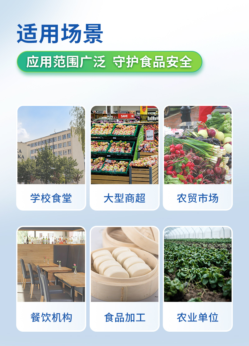 目前廣泛應(yīng)用于市場監(jiān)管局、檢測中心、衛(wèi)生監(jiān)督部門、農(nóng)業(yè)部門、院校及各單位食堂、、商超市場、司法部門、餐飲機構(gòu)、檢驗檢疫部門等單位使用。