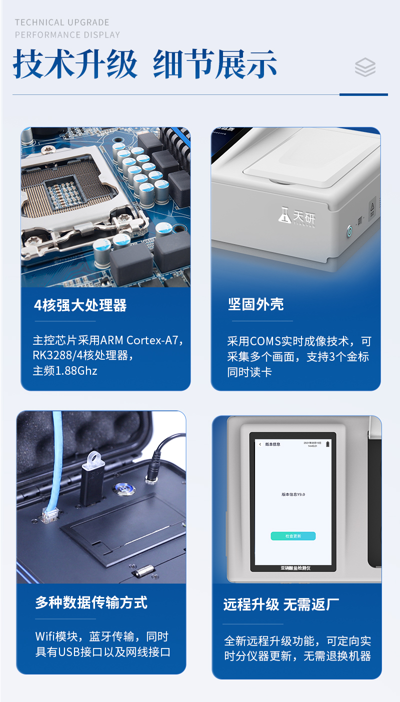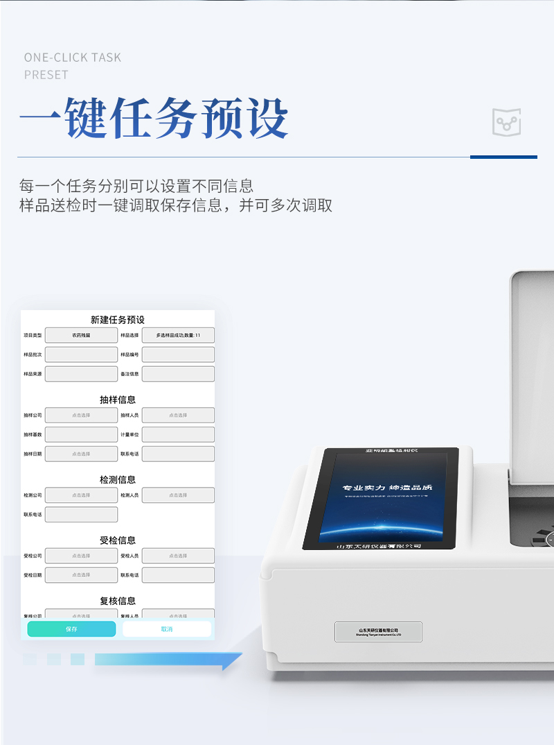 | 儀器采用臺(tái)式一體化系統(tǒng)檢測(cè)技術(shù),將分光光度模塊、數(shù)字化管理模塊、無(wú)線通訊模塊高度集成于一體,可支持檢測(cè)60種食品安全檢測(cè)項(xiàng)目,同時(shí)預(yù)留升級(jí)檢測(cè)方法。 | 儀器檢測(cè)模塊標(biāo)準(zhǔn)化、智能化,檢測(cè)項(xiàng)目可隨意自由組合。檢測(cè)箱體內(nèi)置多個(gè)標(biāo)準(zhǔn)檢測(cè)單元,檢測(cè)模塊可以調(diào)整配置。 | 顯示屏幕:儀器采用10.1英寸豎向液晶觸摸屏顯,搭配運(yùn)行安卓智能操作系統(tǒng),主控芯片采用ARM Cortex-A7,RK3288/4核處理器,主頻1.88Ghz,操作方便,性能更強(qiáng)。 | 檢測(cè)通道:≥12通道;采用精密旋轉(zhuǎn)比色池設(shè)計(jì),使用同芯片同光源校準(zhǔn)精度,解決不同光源之間的誤差值,更加準(zhǔn)確**。(1-12通道間誤差0.1%,專利號(hào):ZL202022821055.2) | 儀器光源:高精度進(jìn)口四波長(zhǎng)冷光源,每個(gè)通道均配置 410、520、590、630nm 波長(zhǎng)光源,標(biāo)配**的光路切換裝置,專利光路切換功能可實(shí)現(xiàn)64波長(zhǎng),并且所有檢測(cè)項(xiàng)目可實(shí)現(xiàn)所有通道同時(shí)檢測(cè)。 | 設(shè)備可一鍵校準(zhǔn),自動(dòng)保存校準(zhǔn)數(shù)據(jù),自動(dòng)對(duì)比校驗(yàn),得到精準(zhǔn)光源,采用Android SP存儲(chǔ)數(shù)據(jù),光源數(shù)據(jù)永不丟失,方便每一次使用。 | 通訊接口:配備無(wú)線通信模塊、4G(APN)通訊模塊、藍(lán)牙傳輸,同時(shí)具有雙USB接口以及RJ45網(wǎng)線接口,可以多方式實(shí)現(xiàn)數(shù)據(jù)保存及數(shù)據(jù)傳輸。 | 存儲(chǔ)方式:支持U盤存儲(chǔ),標(biāo)準(zhǔn)USB接口,免驅(qū)動(dòng)安裝。檢測(cè)結(jié)果存儲(chǔ)容量20萬(wàn)條以上,可生成Excel表格進(jìn)行拷貝,并具有登錄保護(hù)功能。 | 智能化操作系統(tǒng): | 1、操作系統(tǒng):儀器可在同一檢測(cè)界面自動(dòng)對(duì)應(yīng)相關(guān)檢測(cè)通道,一次性選擇1-12個(gè)樣品名稱,無(wú)需退出界面,節(jié)省操作時(shí)間。并可以對(duì)每個(gè)通道屬性和樣品信息單獨(dú)進(jìn)行編輯,例如送檢單位、人員,檢測(cè)人員等,打印時(shí)勾選打印顯示。 | 2、數(shù)據(jù)集成系統(tǒng):設(shè)備首頁(yè)自動(dòng)匯總分析檢測(cè)數(shù)據(jù),包含:周檢測(cè)數(shù)據(jù)、月檢測(cè)數(shù)據(jù),全部檢測(cè)總數(shù)量,均包含檢測(cè)總數(shù),合格數(shù),不合格數(shù),以及相關(guān)柱形分析圖,各項(xiàng)檢測(cè)數(shù)據(jù)一目了然,無(wú)需電腦查詢,更加快捷直觀。 | 3、數(shù)據(jù)庫(kù)系統(tǒng):十幾項(xiàng)數(shù)據(jù)庫(kù)分類管理儀器:包含項(xiàng)目類型、項(xiàng)目數(shù)據(jù)、檢測(cè)數(shù)據(jù)、歷史記錄、國(guó)標(biāo)信息、曲線信息、采樣信息、檢測(cè)信息、受檢信息、復(fù)核信息、圖表信息、光源校準(zhǔn)信息、打印樣式信息、樣品庫(kù)信息等等,數(shù)據(jù)庫(kù)之間互相協(xié)調(diào)聯(lián)動(dòng)保證數(shù)據(jù)的真實(shí)完整性。同時(shí)產(chǎn)品數(shù)據(jù)庫(kù)以及歷史檢測(cè)記錄支持一鍵檢索功能。 | 4、限量規(guī)判系統(tǒng):具有限量查詢、添加物質(zhì)合規(guī)判定系統(tǒng)。檢測(cè)出結(jié)果后,系統(tǒng)自動(dòng)調(diào)用系統(tǒng)數(shù)據(jù)庫(kù)中相關(guān)國(guó)標(biāo)進(jìn)行比對(duì)判定,客觀顯示判定結(jié)果是否合格。 | 5、項(xiàng)目預(yù)設(shè)系統(tǒng):儀器具有任務(wù)預(yù)設(shè)模塊,一鍵提前預(yù)設(shè),給出方便快捷的新檢測(cè)方案,每一個(gè)任務(wù)分別可以設(shè)置不同的樣品、批次、編號(hào)、來(lái)源、備注、抽樣信息、檢測(cè)信息、受檢信息、復(fù)核信息等更多信息。樣品送檢時(shí)一鍵調(diào)取保存信息,并可多次調(diào)取,大大提高檢測(cè)效率。 | 6、數(shù)據(jù)監(jiān)管系統(tǒng):同步對(duì)接監(jiān)管平臺(tái),數(shù)據(jù)可局域網(wǎng)和互聯(lián)網(wǎng)數(shù)據(jù)上傳,檢測(cè)結(jié)果可選擇直接傳至食品安全監(jiān)管平臺(tái)。進(jìn)行區(qū)域食品安全監(jiān)管及大數(shù)據(jù)分析處理與數(shù)據(jù)統(tǒng)計(jì),檢測(cè)區(qū)域食品安全長(zhǎng)短期動(dòng)態(tài),達(dá)到食品安全問題預(yù)估、預(yù)警。 | 7.1、全新打印系統(tǒng):內(nèi)置全新打印機(jī),新創(chuàng)自定義打印方式,可按需靈活勾選控制:二維碼,抽樣信息、檢測(cè)信息,受檢信息、復(fù)核信息、抽樣日期、檢測(cè)日期等信息的打印。 | 7.2、A4紙版本報(bào)告打印功能(可選配):設(shè)備擁有兩種結(jié)果展示方式,可以自動(dòng)生成A4打印模板和小票打印模板兩種樣式,可通過WiFi及網(wǎng)線等方式鏈接外置打印機(jī)可進(jìn)行打印。 | 8.供電模式:儀器交直流兩用,直流12V供電,可連接車載電源,可配6ah大容量充電鋰電池,電量可實(shí)時(shí)顯示,方便戶外流動(dòng)測(cè)試。 | 9.儀器具備遠(yuǎn)程升級(jí)功能,可定向分客戶分儀器更新,開機(jī)后自動(dòng)更新,并可持續(xù)性免費(fèi)更新系統(tǒng)版本,無(wú)需像傳統(tǒng)產(chǎn)品返廠更新,節(jié)省時(shí)間及人力成本并避免了物流運(yùn)輸返廠升級(jí)導(dǎo)致設(shè)備損壞的潛在風(fēng)險(xiǎn)。 |