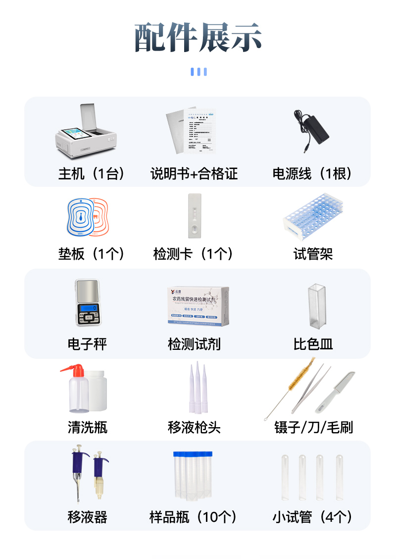 | 儀器采用臺式一體化系統(tǒng)檢測技術(shù),將分光光度模塊、新型農(nóng)殘檢測模塊、數(shù)字化管理模塊、無線通訊模塊高度集成于一體,支持檢測200種食品安全檢測項(xiàng)目,同時預(yù)留升級檢測方法。 | 儀器檢測模塊標(biāo)準(zhǔn)化、智能化,可隨意自由組合。檢測箱體內(nèi)置多個標(biāo)準(zhǔn)檢測單元,檢測模塊可以調(diào)整配置。 | 儀器采用全新安卓智能系統(tǒng),主控芯片采用 ARM Cortex-A7,RK3288/4核處理器,10.1寸高清液晶觸摸豎屏,更加**的UI交互界面,運(yùn)轉(zhuǎn)快捷;儀器配備無線通信模塊: 4G(APN)通訊模塊、Wifi模塊,藍(lán)牙傳輸,同時具有雙USB接口以及RJ45接口能以多種方式實(shí)現(xiàn)數(shù)據(jù)保存和數(shù)據(jù)傳輸功能。 | 創(chuàng)新檢測模式: | ★檢測通道:≥12通道;采用精密旋轉(zhuǎn)比色池設(shè)計,使用同芯片同光源校準(zhǔn)精度,解決不同光源之間的誤差值。1-12通道間誤差0.1%。(專利號:ZL202022821055.2) | ★儀器具有自動識別比色皿檢測功能,即:將樣品比色皿放入儀器后,點(diǎn)擊樣品檢測,儀器自動識別比色皿進(jìn)行通道檢測。 | 進(jìn)口高精光源: | 高精度進(jìn)口四波長冷光源,通道配置 410、520、590、630nm 波長光源,一個光源芯片驅(qū)動一個光源,誤差極小,每臺設(shè)備單獨(dú)**校準(zhǔn)光源,**比對,同時參照四種不同波段光源全方位覆蓋市面上99%的農(nóng)殘食品項(xiàng)目檢測。 | 智能化操作系統(tǒng): | 便捷操作系統(tǒng):設(shè)備檢測時可在同一檢測界面自動對應(yīng)相關(guān)檢測通道一次性選擇1-12個樣品名稱,無須退出界面,節(jié)省操作時間。 | 數(shù)據(jù)集成系統(tǒng):設(shè)備首頁自動統(tǒng)計檢測數(shù)據(jù)包含:周檢測數(shù)據(jù)、月檢測數(shù)據(jù),全部檢測總數(shù)量,均包含檢測總數(shù),合格數(shù),不合格數(shù),以及相關(guān)柱形分析圖,對各項(xiàng)檢測數(shù)據(jù)清晰掌握,無需電腦查詢,更加快捷直觀。 | 項(xiàng)目預(yù)設(shè)系統(tǒng):支持添加單個及多個相同或不相同的任務(wù)預(yù)設(shè),一鍵快速調(diào)取,每一個任務(wù)分別可以設(shè)置不同的樣品、批次、編號、來源、備注、抽樣信息、檢測信息、受檢信息、復(fù)核信息等更多信息。無縫鏈接平臺和APP實(shí)時查看下發(fā)任務(wù)。 | 數(shù)據(jù)監(jiān)管系統(tǒng):同步對接監(jiān)管平臺,數(shù)據(jù)可局域網(wǎng)和互聯(lián)網(wǎng)數(shù)據(jù)上傳,檢測結(jié)果可選擇直接傳至食品安全監(jiān)管平臺。集成OSS輸出存儲服務(wù)、區(qū)分設(shè)備定向管理應(yīng)用,進(jìn)行區(qū)域食品安全監(jiān)管及大數(shù)據(jù)分析處理與數(shù)據(jù)統(tǒng)計,檢測區(qū)域食品安全長短期動態(tài),達(dá)到食品安全問題預(yù)估、預(yù)警。 | 自定義打印系統(tǒng):內(nèi)置全新打印系統(tǒng),新創(chuàng)自定義打印方式,可按需靈活設(shè)置開啟或關(guān)閉:產(chǎn)品合格證(國家農(nóng)業(yè)部標(biāo)準(zhǔn)要求),二維碼,抽樣信息、檢測信息,受檢信息、復(fù)核信息、抽樣日期、檢測日期等信息的打印。 | 系統(tǒng)遠(yuǎn)程更新功能:可定向分客戶分儀器更新系統(tǒng),按照不同客戶后期實(shí)際需求添加項(xiàng)目,無需機(jī)器返廠,即可遠(yuǎn)程實(shí)時升級全新系統(tǒng),節(jié)省時間成本及避免運(yùn)輸造成設(shè)備損壞。 | 儀器主機(jī)采用一體化防水、抗壓、防撞擊、防腐蝕箱體設(shè)計,同時配備交直流供電,可連接車載電源,可選配大容量充電鋰電池,滿足現(xiàn)場野外檢測需求。 | 安全證書,放心保障:儀器具有中國計量科學(xué)研究院校準(zhǔn)證書,**認(rèn)證。 |