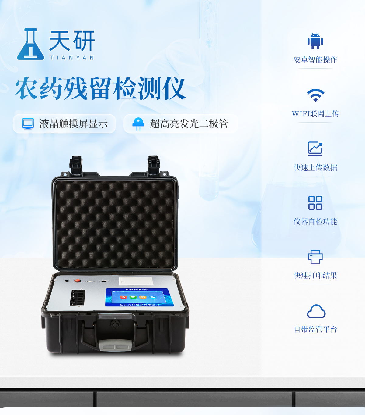 | 隨著人民生活水平的不斷提升,市場對茶葉的把控愈加嚴格。針對現(xiàn)狀,我司專門研發(fā)生產--茶葉專用的農藥殘留速測儀;定位茶農、茶商、茶葉企業(yè)使用。 此外還可用于果蔬茶生產基地和農貿批發(fā)銷售市場現(xiàn)場檢測,餐館、學校、食堂、家庭果蔬加工前的安全速測等。 | 檢測通道: 5個檢測通道,可以同時測試多個樣品,每個樣品由程序控制分別獨立工作,不會互相干擾。 | 顯示方式:≥5英寸液晶觸摸屏顯示,人性化中文操作界面,讀數(shù)直觀、簡單。 | 配備嵌入式高速熱敏打印機,可選擇手動打印或者自動打印,三分鐘出打印結果。 | 光源采用進口超高亮發(fā)光二極管,具有低功耗、穩(wěn)定性強、高靈敏度,高檢測精度,高重復性精度,光源可控、響應速度快等優(yōu)點。 | 采用標準USB接口設計,免驅動安裝,方便數(shù)據(jù)的存貯和移動,并可隨時與計算機直接相連,并且可用計算機控制儀器。實現(xiàn)數(shù)據(jù)查詢、瀏覽、分析、統(tǒng)計、打印等。 | 智能化程度高,儀器具有自檢功能:具有開機自檢和調零功能,具有自動檢測重復性功能 | 內置強大的數(shù)據(jù)庫,可在儀器上直接選擇樣品名稱、檢測指標、送檢單位等信息,也可在儀器上直接編輯錄入樣品名稱、檢測指標、送檢單位等信息并保存進樣品數(shù)據(jù)庫。 | 支持Wifi網絡,數(shù)據(jù)可局域網和互聯(lián)網數(shù)據(jù)上傳,檢測結果直接傳至食品安全監(jiān)管平臺。進行區(qū)域食品安全監(jiān)管及大數(shù)據(jù)分析處理,檢測區(qū)域食品安全長短期動態(tài),達到食品安全問題預估、預警 |