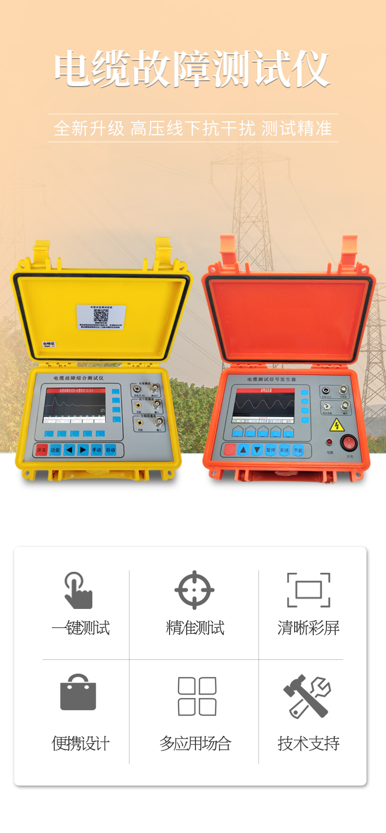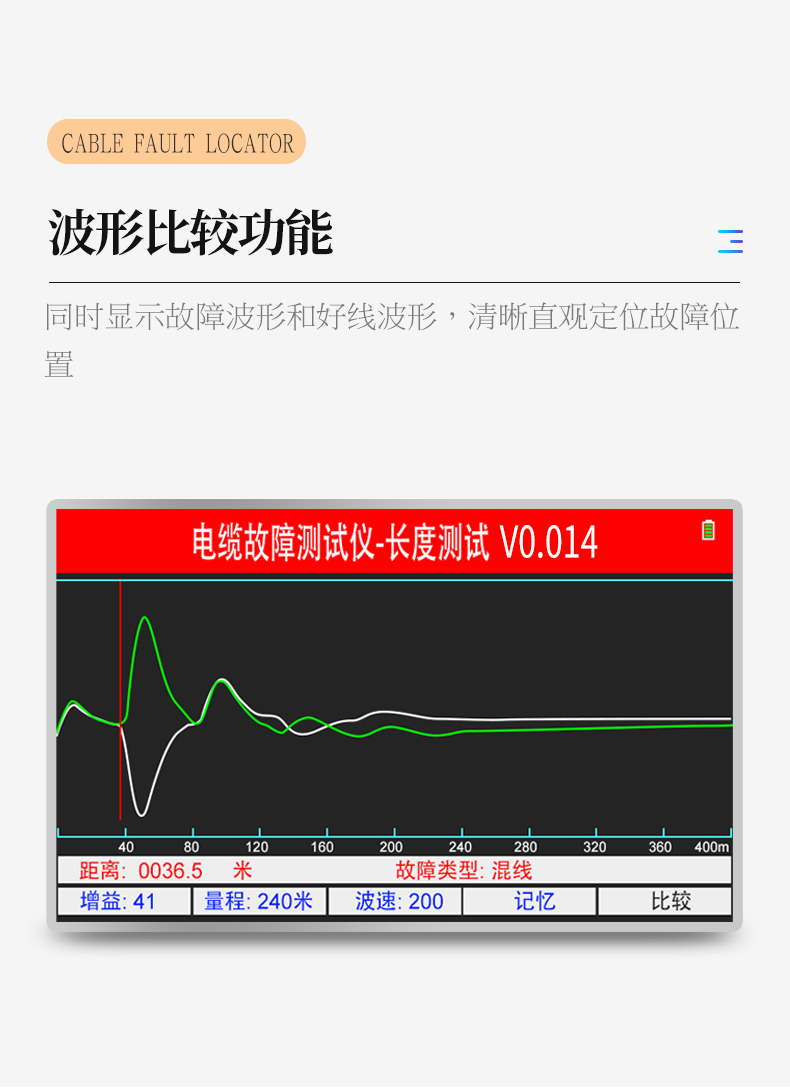 | 1.480*800大屏幕真彩手機(jī)細(xì)膩屏在陽光下也能清晰可辨。 | 2.自帶數(shù)據(jù)接口,支持客戶遠(yuǎn)程升級。 | 3.采用ARM CPU配合FPGA技術(shù),可快速準(zhǔn)確判斷故障波形。 | 4.波形比較功能,特別適用于線路某點(diǎn)氧化造成后端電壓 | 低故障的測試定位。 | 5.簡潔的對應(yīng)功能按鍵易學(xué)易會直觀方便。 | 6.高能量鋰電池,使用時(shí)間可達(dá)6-8小時(shí)。 | 7.信號器自帶萬用表功能方便測試電壓電阻及絕緣。 |