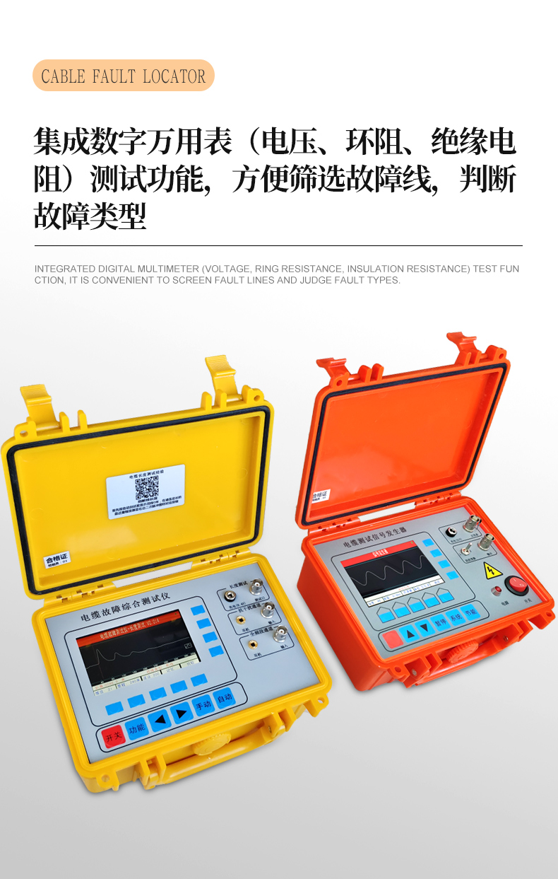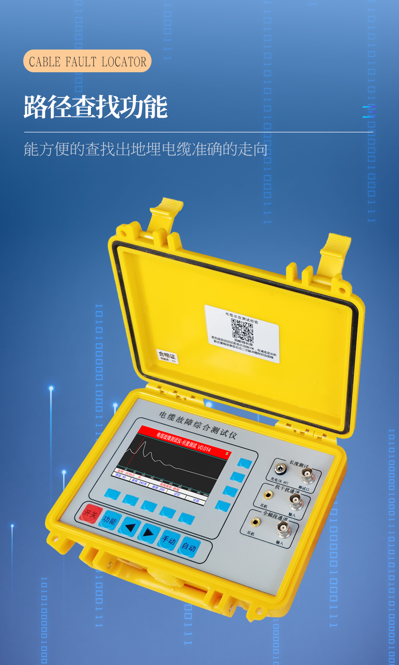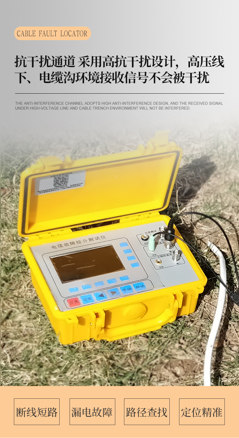 產(chǎn)品概述: 本測試儀主要用于10KV等級(可拓展至50kv)以內(nèi)的高低壓地埋電力電纜的斷線、短路、對地漏電故障( 對地絕緣電阻在0.5兆歐以內(nèi))的定位及地埋電纜深度、路徑走向的探測 適用于路燈電纜維護(hù)、農(nóng)田水澆地電纜故障查修、小區(qū)物業(yè)及園林綠化帶地埋鎧甲鐵皮電力電纜、野外動(dòng)力電纜、高速公
