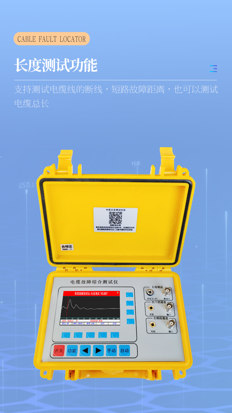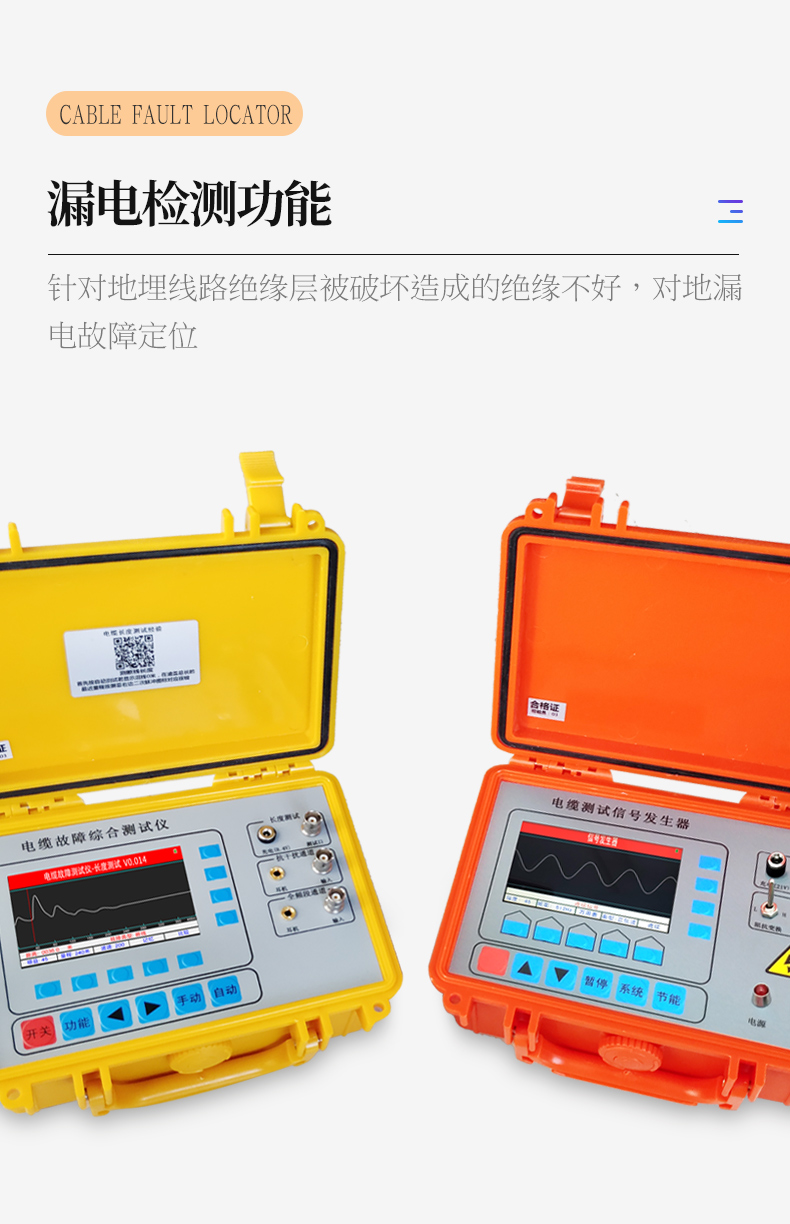 | 1、長度測試:斷電狀態(tài)下可以直接測試電纜的斷線、短路故障距離長度。 | 2、斷電狀態(tài)下配合信號發(fā)生器定位直埋電纜對地漏電位置,測地埋電纜路徑走向及深度。 | 3、全頻段通道:通電狀態(tài)下使用探桿測試直埋低壓電纜對地輕微漏電故障位置。是縮短故障查找時(shí)間、提高工作效率、減輕線路維護(hù)人員勞動(dòng)強(qiáng)度的得力工具。 |