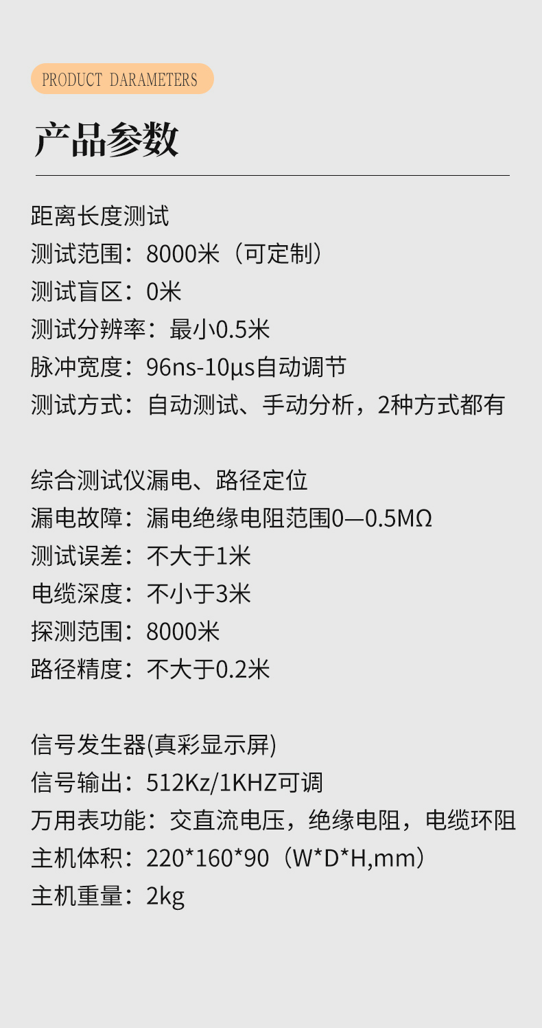 | 綜合測試儀距離長度測試: | 測試范圍: 8000米(可定制) | 測試盲區(qū): 0米 | 測試分辨率:最小0.5米 | 脈沖寬度: 96ns-10μs自動(dòng)調(diào)節(jié) | 測試方式:自動(dòng)測試、手動(dòng)分析,2種方式都有 | 綜合測試儀漏電、路徑定位: | 漏電故障:漏電絕緣電阻范圍0-0.5MΩ | 測試誤差:不大于1米 | 電纜深度:不小于3米 | 探測范圍: 8000米 | 路徑精度:不大于0.2米. | 信號發(fā)生器(真彩顯示屏) : | 信號輸出:1KHZ可調(diào) | 萬用表功能:交直流電壓、絕緣電阻、電纜環(huán)阻 | 主機(jī)體積: 220*1 60*90 (W*D*H, mm) | 主機(jī)重量: 2kg |