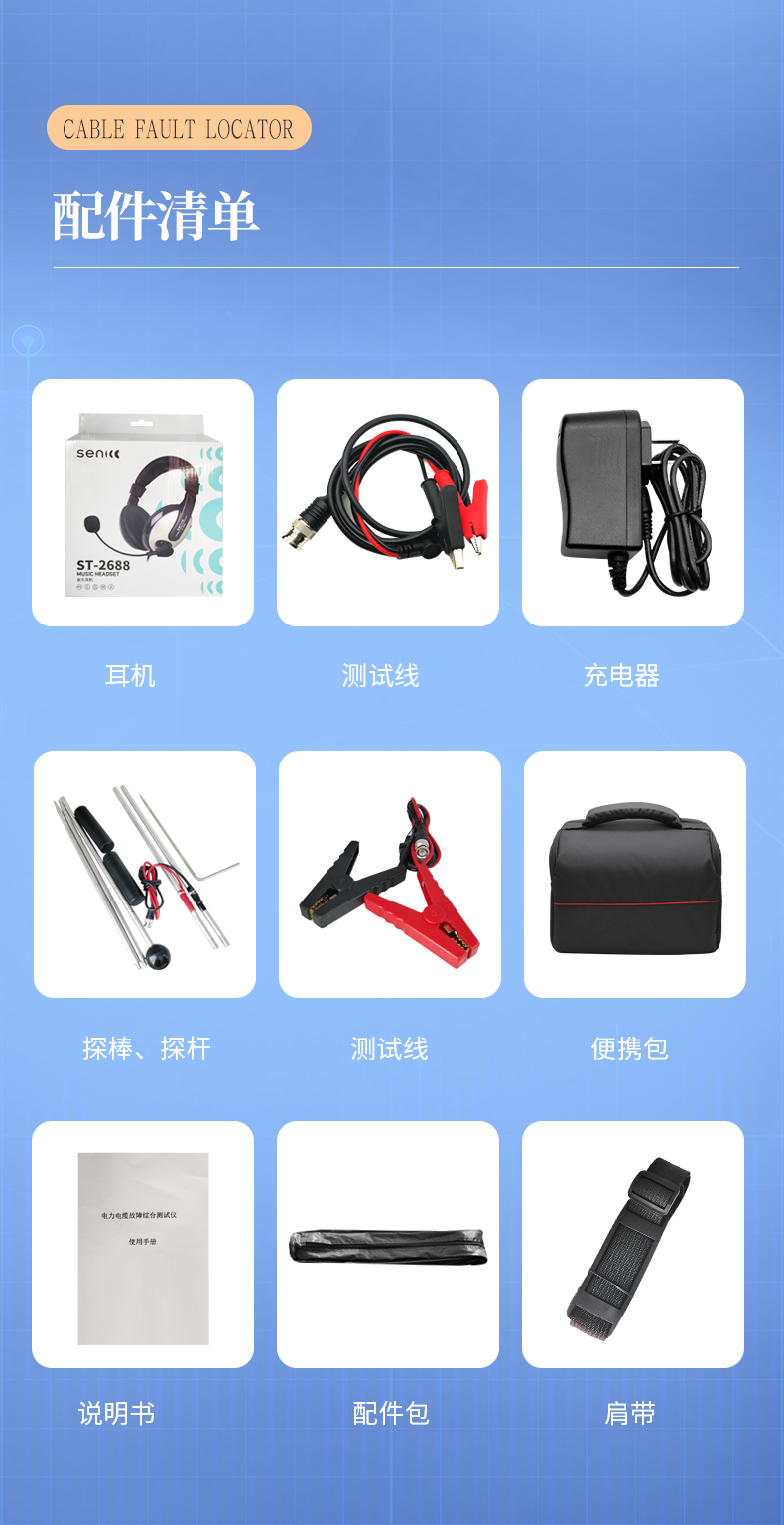 | 測試儀主機(jī)........... 1臺 | 信號發(fā)生器........... 1臺 | 測試耳機(jī).............. 1個(gè) | 專用充電器........... 2個(gè) | 路徑探頭...............1付 | 漏電探桿.............. 1付 | 長度測試線(信號器連接線..與長度測試通用)......1條 | 接地釬.................. 1個(gè) | 儀器包.................. 2個(gè) | 說明書.................. 1個(gè) | 合格證保修卡.........1組 |
