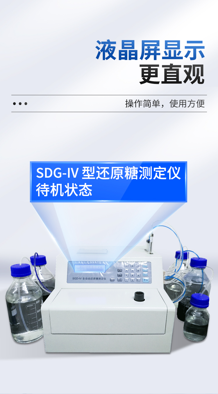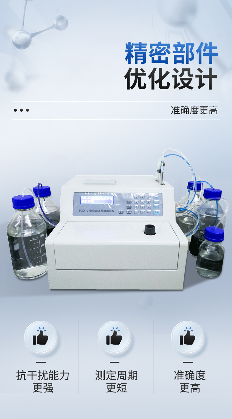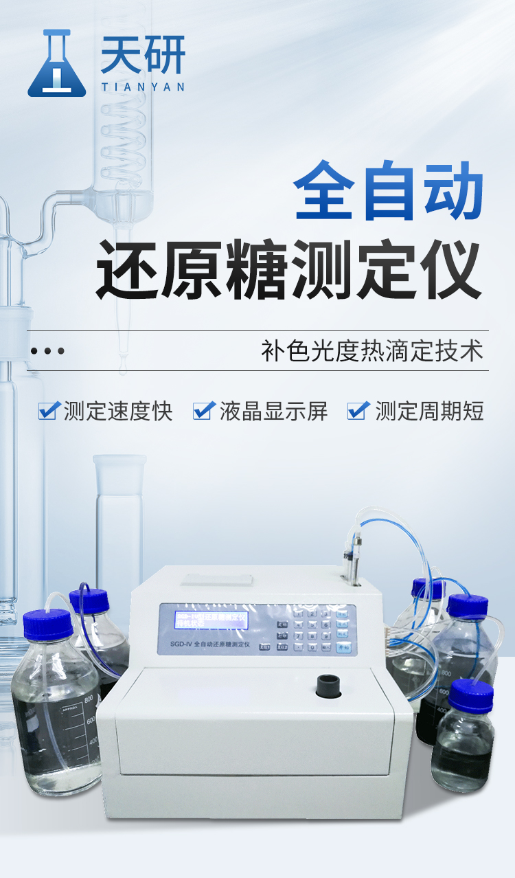全自動還原糖測定儀是根據(jù)費林試劑測定原理設(shè)計而成的,其原理與目前國家標準一致。IV型全自動還原糖測定儀實現(xiàn)試劑泵、滴定泵自動排氣泡,操控更方便;采用精密部件優(yōu)化設(shè)計,準確度更高;測定時間縮短至3分鐘以內(nèi),測定速度更快;液晶屏顯示更直觀。