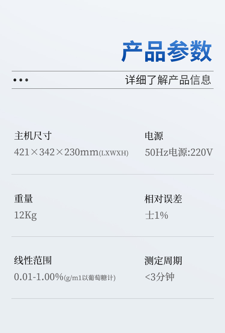 | 電源:50Hz電源:220V | 主機尺寸:421X342X230mm(LXWXH) | 重量:12Kg | 相對誤差:士1% | 線性范圍:0.01-1.00%(g/m1以葡萄糖計)測定周期:<3分鐘 |
