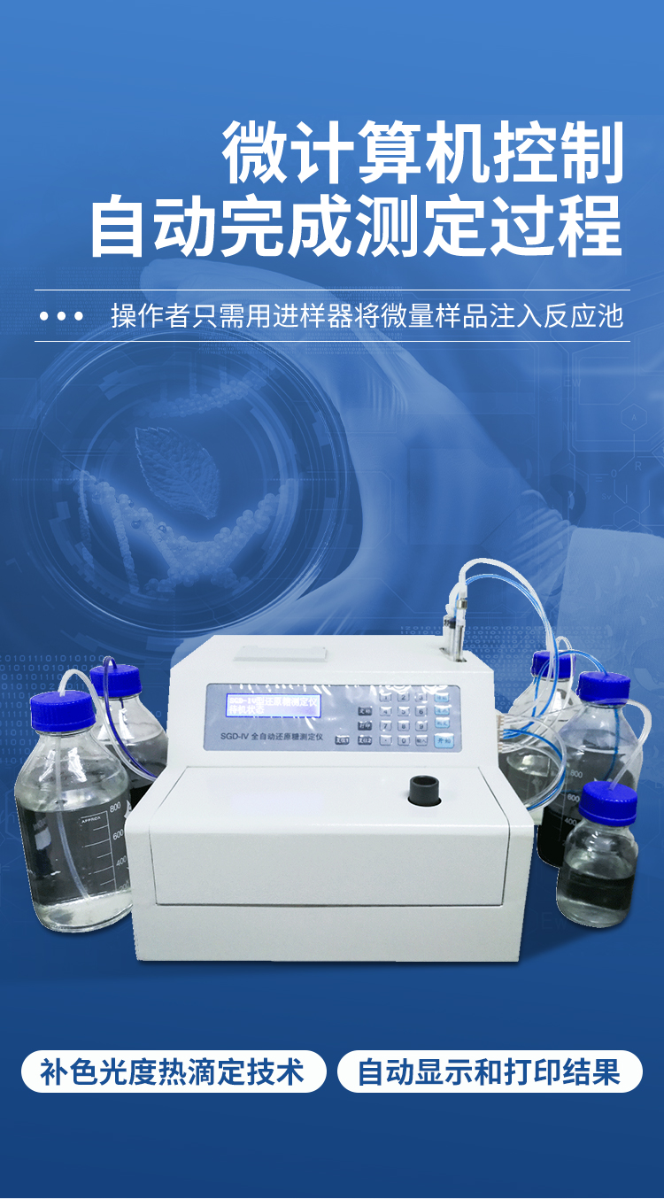 為適應(yīng)我國食品、醫(yī)藥發(fā)酵行業(yè)生產(chǎn)控制技術(shù)和過程分析中還原糖的快速檢測需求,在總結(jié)III型儀器應(yīng)用基礎(chǔ)上,研制出了全新全自動還原糖測定儀。該儀器采用補色光度熱滴定技術(shù),滴定的各種條件由微計算機控制,操作者只需用進樣器將微量樣品注入反應(yīng)池就可自動完成測定過程,并自動顯示和打印結(jié)果,操作更簡單,使用更方便,抗干擾能力更強,測定周期更短,準確度更高。
