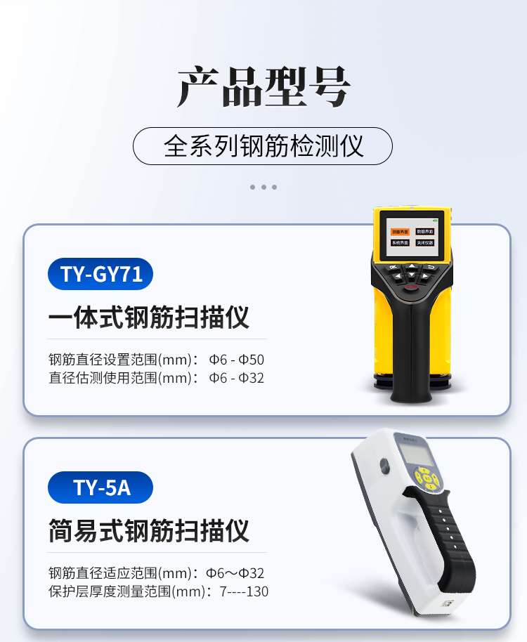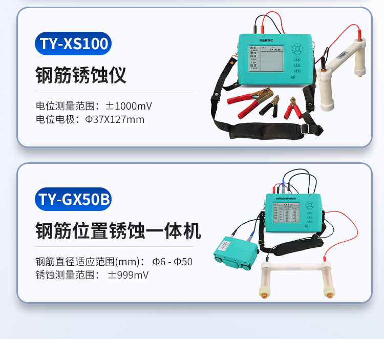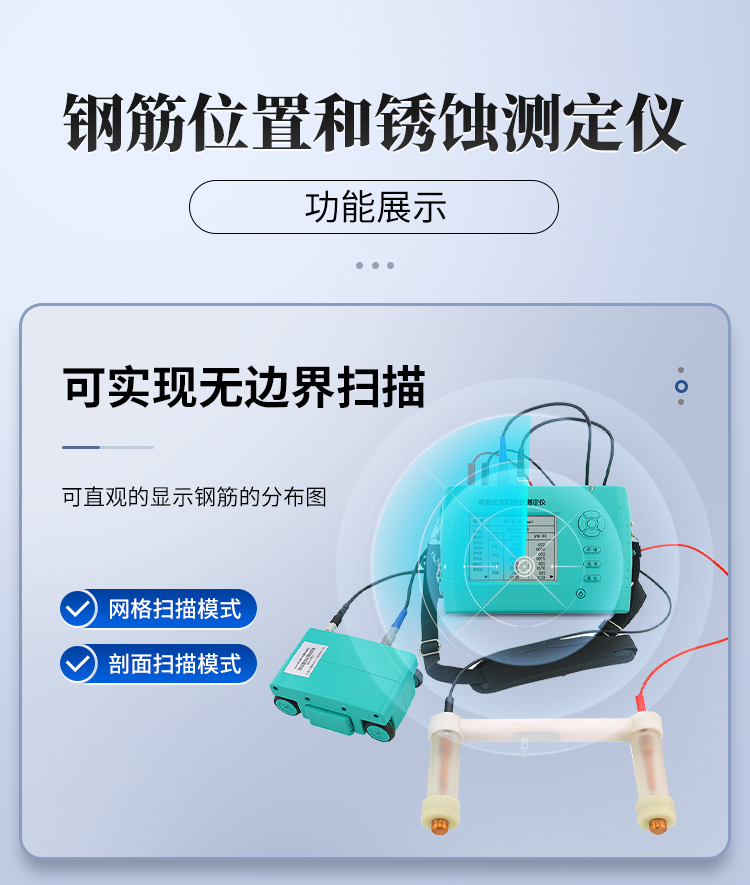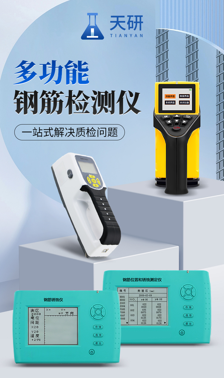 鋼筋位置和銹蝕測定儀TY-GX50B,集鋼筋儀和銹蝕儀的功能于一體,是集檢測鋼筋混凝土內(nèi)部鋼筋直徑、位置、分布、鋼筋的混凝土保護層厚度及鋼筋的銹蝕程度等功能于一體的新一代綜合類鋼筋檢測設備。