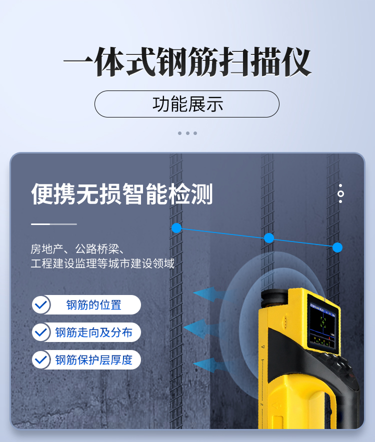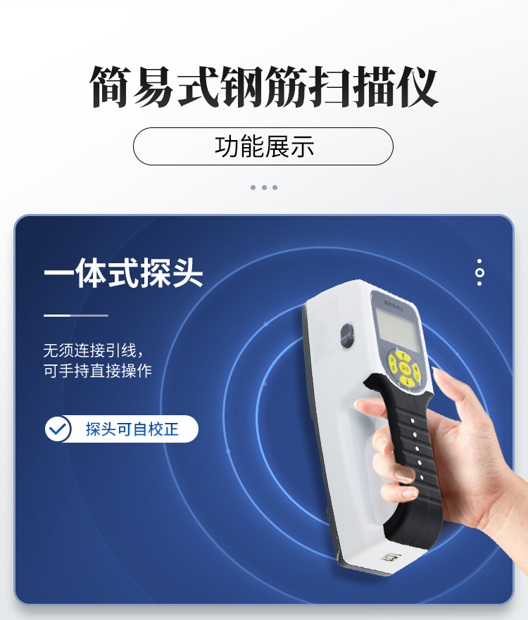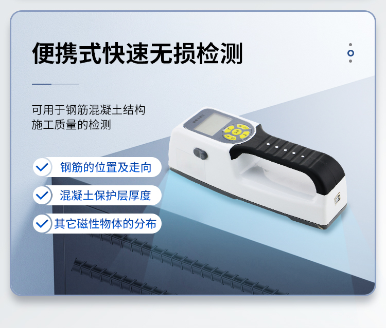 產(chǎn)品簡介:該機為內(nèi)置一體式探頭,無須連接引線,可手持直接操作是一種便攜式無損鋼筋保護層厚度檢測儀器。可用于鋼筋混凝土結構施工質(zhì)量的檢測。能夠在混凝土表面確定鋼筋的位置、布筋情況,測量混凝土保護層厚度,此外也可對混凝土結構中的磁性體及導電體的位置進行檢測,如墻體內(nèi)的電纜、水暖管道等,施工前的探測可以有效