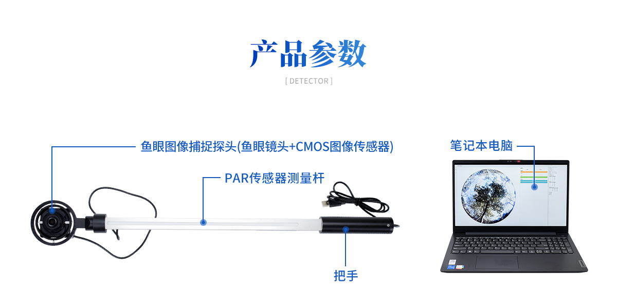 植物冠層圖像分析儀由魚眼圖像捕捉探頭(由魚眼鏡頭及CCD圖像傳感器組成)、內(nèi)置25個(gè)PAR傳感器的測(cè)量桿(搖臂)、筆記本電腦、圖像采集軟件及圖像 分析軟件組成。魚眼探頭安裝在一個(gè)很輕的搖臂的頂端,它可以獲取150°視角的魚眼圖像。圖像的顯示和存貯由配置的筆記本計(jì)算機(jī)完成。