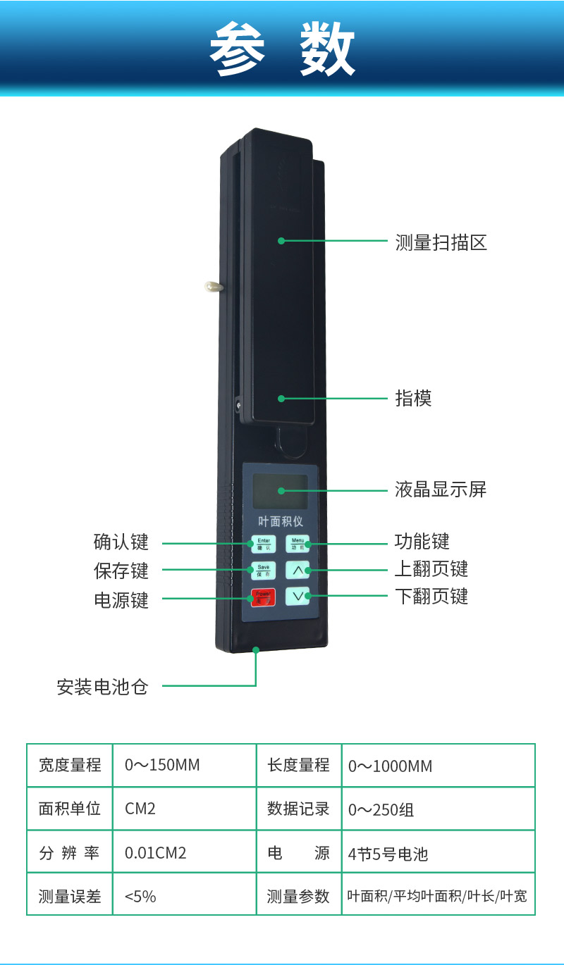 | (1)面積單位:cm2 | (2)分辨率:0.01cm2 | (3)測(cè)量誤差:<5% | (4)寬度量程:0~150mm | (5)長(zhǎng)度量程:0~1000mm | (6)數(shù)據(jù)記錄:0~250組 | (7)電源:4節(jié)5號(hào)電池 |