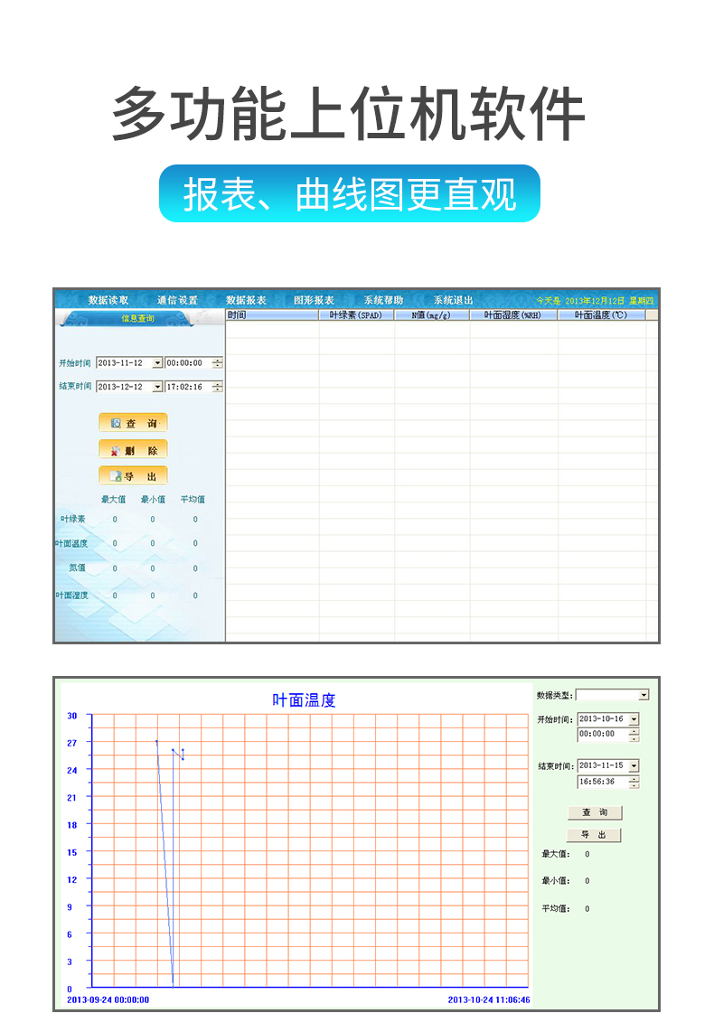| 快速無損植物活體檢測,不影響植物成長。 | 一次操作可同時測定所有參數(shù),實時顯示。 | 氮,葉綠素,葉溫三種參數(shù)同一屏幕同時顯示,且可同時儲存 | 歷史數(shù)據(jù)查看,即可順序查看。 | 測量數(shù)據(jù)可連接計算機將測量數(shù)據(jù)導出,便于植物養(yǎng)分的管理和分析。 | 歷史數(shù)據(jù)查看,即可順序查看,也可跳轉(zhuǎn)查看。 | 意外斷電后已保存在主機里的數(shù)據(jù)不丟失。 | 對于歷史數(shù)據(jù)可以一鍵式全部刪除。 | 可連接計算機將測量數(shù)據(jù)導出,便于植物養(yǎng)分的管理和分析。 | 使用鋰電池供電,帶背光功能。 | 每種參數(shù)的報表、曲線圖均可選擇時段查詢查看。 | 可將存儲記錄的數(shù)據(jù)以EXCEL格式備份保存,方便以后調(diào)用。 | 可將存儲記錄的數(shù)據(jù)曲線圖以BMP圖片格式備份保存,方便以后調(diào)用。 |