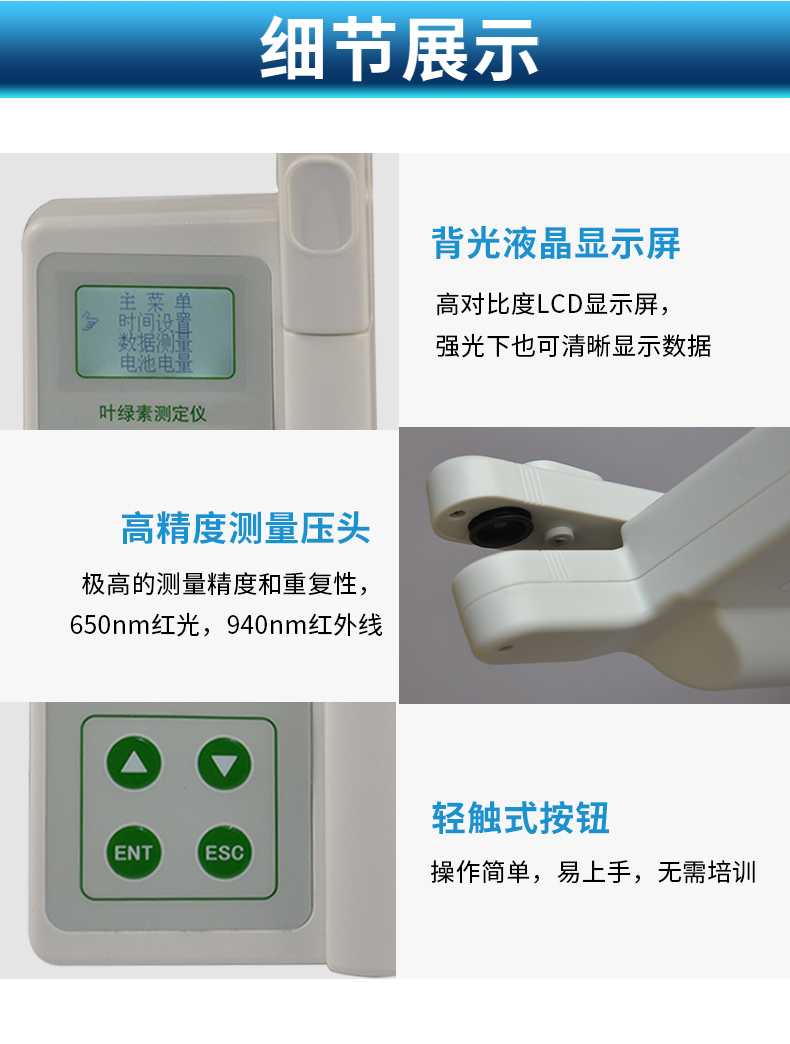 氮素含量一般情況下直接反應作物的健康情況,生長狀態(tài)、了解植物真實的硝基需求量和土壤硝基的缺乏程度或是否過多地施加了氮肥,廣泛應用于氮肥管理,除草劑應用,葉片衰老,環(huán)境脅迫等研究,葉綠素測量儀在農(nóng)業(yè)種植過程中有很大的意義。 葉 綠素含量的測定結(jié)果是SPAD值,是葉片在兩種波長650nm 和940nm,葉片傳輸光的數(shù)量進行比值計算,來確定葉片當前葉綠素的相對數(shù)量(兩種波長范圍內(nèi)的透光系數(shù)來確定葉片當前葉綠素的相對數(shù)量 ),SPAD值與葉綠素之間成正比關(guān)系,因此SPAD值往往間接地可代表葉綠素值,從而可以評估植物健康狀況、生長狀態(tài),因而在農(nóng)業(yè)中,時常使用葉綠素計 來進行對植物葉綠素含量進行檢測,以此來進行指導氮肥的施用量,因而在農(nóng)業(yè)種植過程中使用葉綠素計來進行指導氮元素含量的施肥,同時在很多植物中,以此來 進行判斷植物的抗逆性。 葉溫常用來表示植物的體溫狀況,植物葉片中所有的化學反應,都受葉片溫度的影響,在植物生理活動的分析中經(jīng)常用到。葉溫與 氣溫的差值,可以表明植物的缺水情況或受旱程度。因為當水分供應充足時,植物蒸騰正常,蒸騰耗熱可以降低植物體溫,這時葉溫比氣溫低;反之受旱時,植物體 溫上升,可高于當時的氣溫。