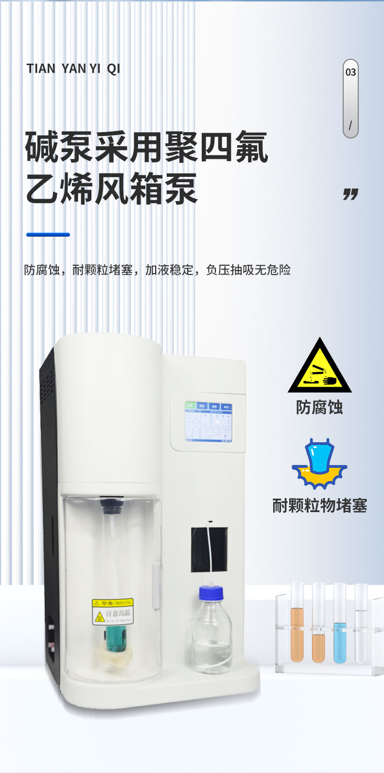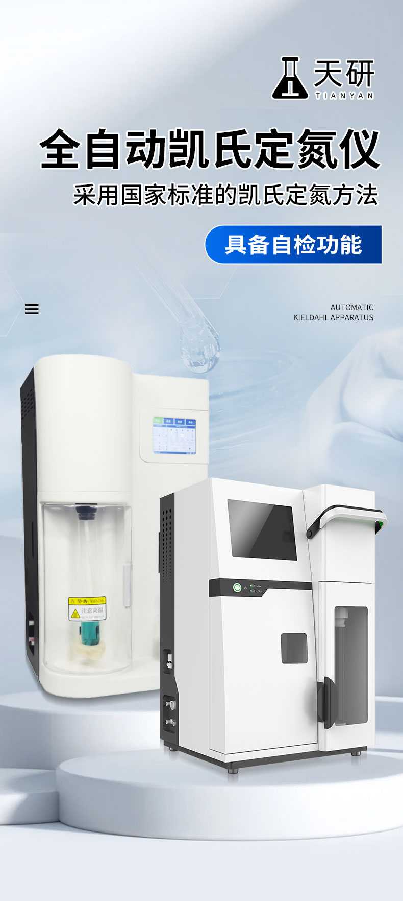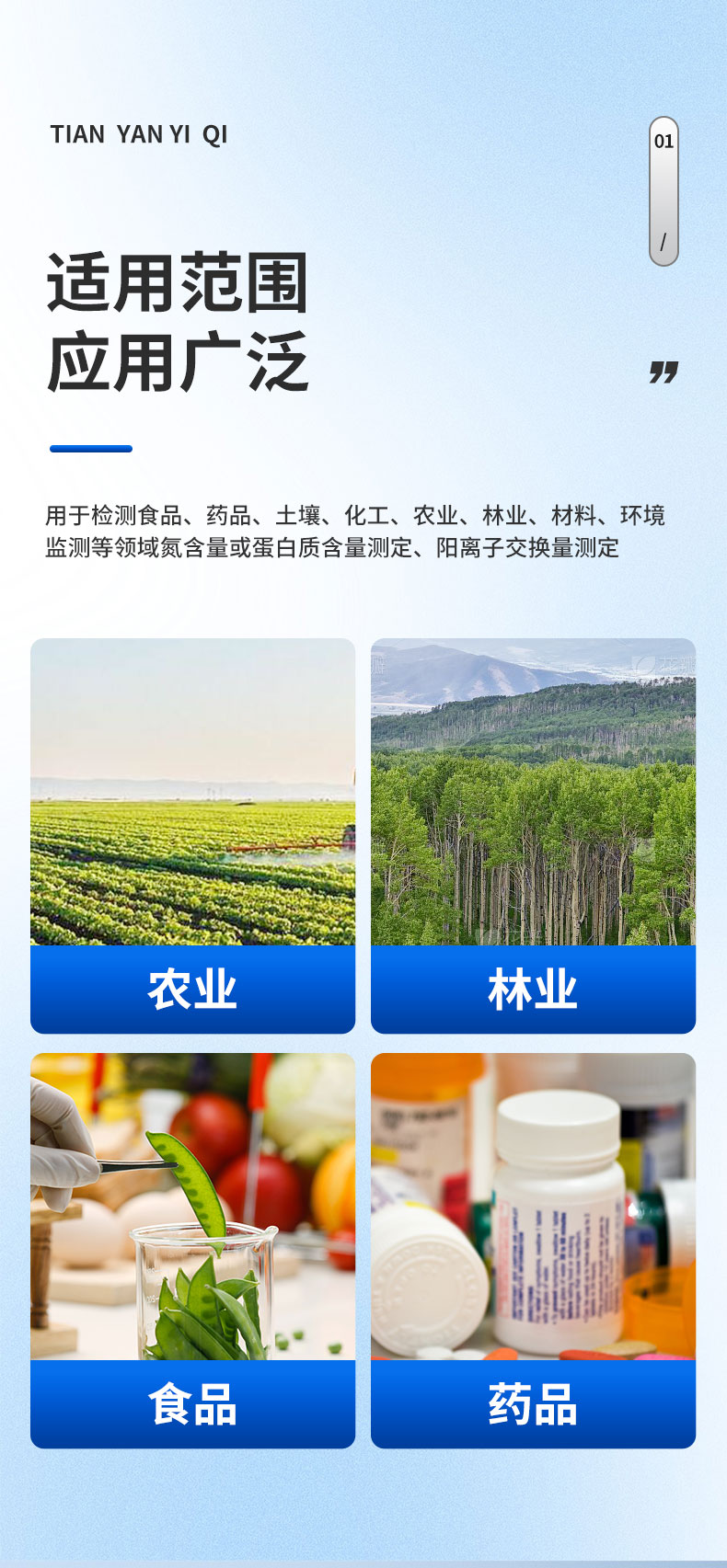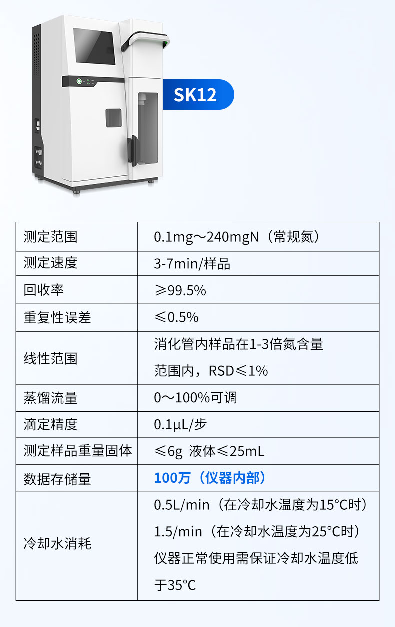 用于檢測食品、藥品、土壤、化工、農(nóng)業(yè)、林業(yè)、材料、環(huán)境監(jiān)測等領(lǐng)域氮含量或蛋白質(zhì)含量測定、陽離子交換量測定。