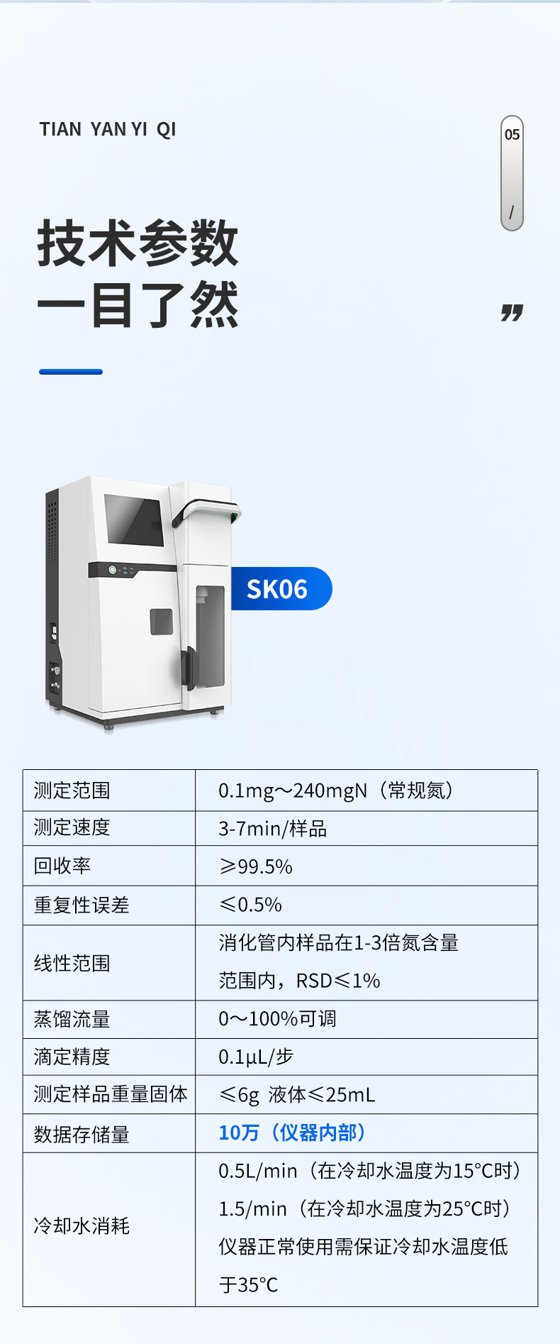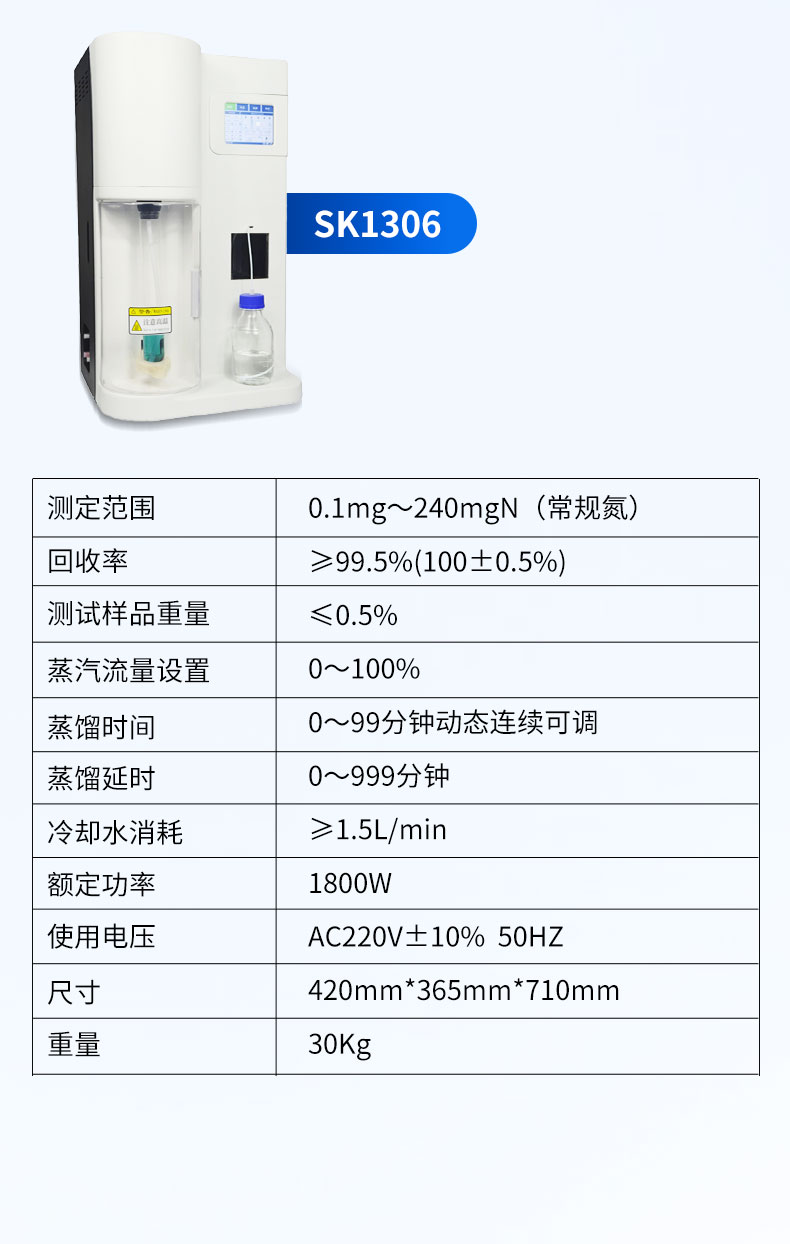 | 1. 測試范圍:0.1mg~240mgN | 2.☆回收率:≥99.5%(100±0.5%) | 3. 重復(fù)性誤差:±0.5% | 4. ☆測試樣品重量:固體≤6g 液體≤25ml | 5. 蒸汽流量設(shè)置:0~100% | 6. 蒸餾時間:0~99分鐘動態(tài)連續(xù)可調(diào) | 7. 蒸餾延時:0~999分鐘 | 8. 冷卻水消耗:≥1.5L/min | 9.額定功率:1800W | 10.使用電壓:AC220V±10% 50HZ | 11.尺寸:420mm*365mm*710mm | 12.重量:30Kg |