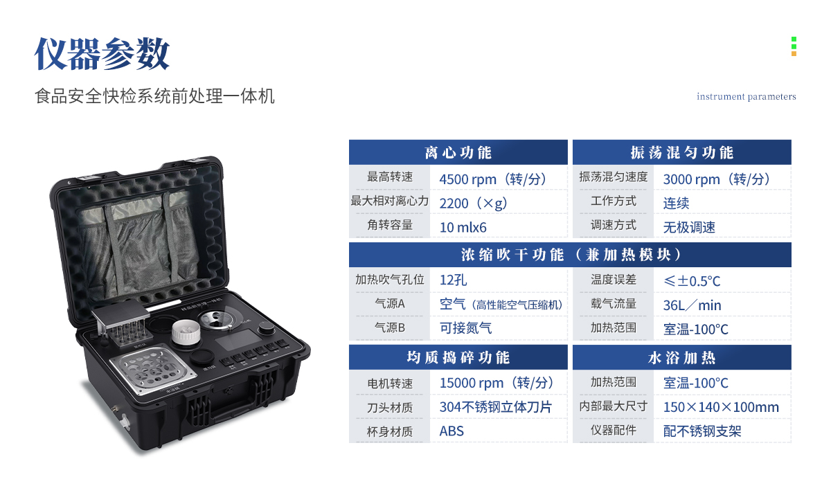 | 離心功能 1.**轉(zhuǎn)速:4500 rpm(轉(zhuǎn)/分) 2.最大相對離心力:2200(×g) 3.角轉(zhuǎn)容量:10 mlx6 (可選配20mlx6) | 振蕩混勻功能 1.振蕩混勻速度:3000 rpm(轉(zhuǎn)/分) 2.工作方式:連續(xù) 3.調(diào)速方式:無極調(diào)速 | 均質(zhì)搗碎功能 1.電機轉(zhuǎn)速:15000 rpm(轉(zhuǎn)/分) 2.刀頭材質(zhì):304不銹鋼立體刀片 3.杯身材質(zhì):ABS | 濃縮吹干功能(兼加熱模塊) 1.加熱吹氣孔位: 12孔 2.氣源A: 空氣(高性能空氣壓縮機) 氣源B: 可接氮氣 3.溫度誤差:≤±0.5℃ 4.載氣流量:36L/min 5.加熱范圍:室溫-100℃ | 水浴加熱 1.加熱范圍:室溫-100℃ 2.內(nèi)部最大尺寸:150mmX140mmX100mm 3.配不銹鋼支架 |