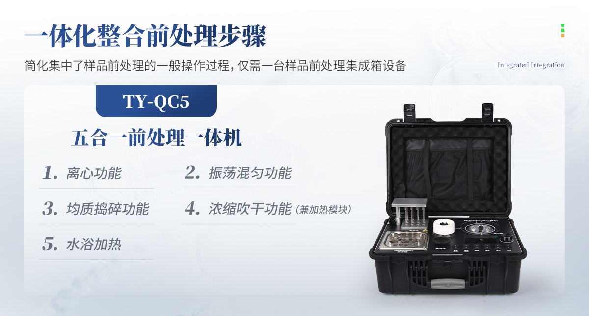 應國內(nèi)用戶的實際需求,自行研制開發(fā)的新型儀器——QC05型樣品前處理一體機。樣品前處理集成箱將樣本前處理過程中樣品濃縮、水浴恒溫、離心分層、均質(zhì)、振蕩混勻等步驟所需設備進行集成,僅需一臺樣品前處理集成箱設備即可完成所有樣本前處理過程,并且方便攜帶,不僅適用于現(xiàn)場檢測使用,還可用于色譜、質(zhì)譜等分析樣品的純化和制備。
