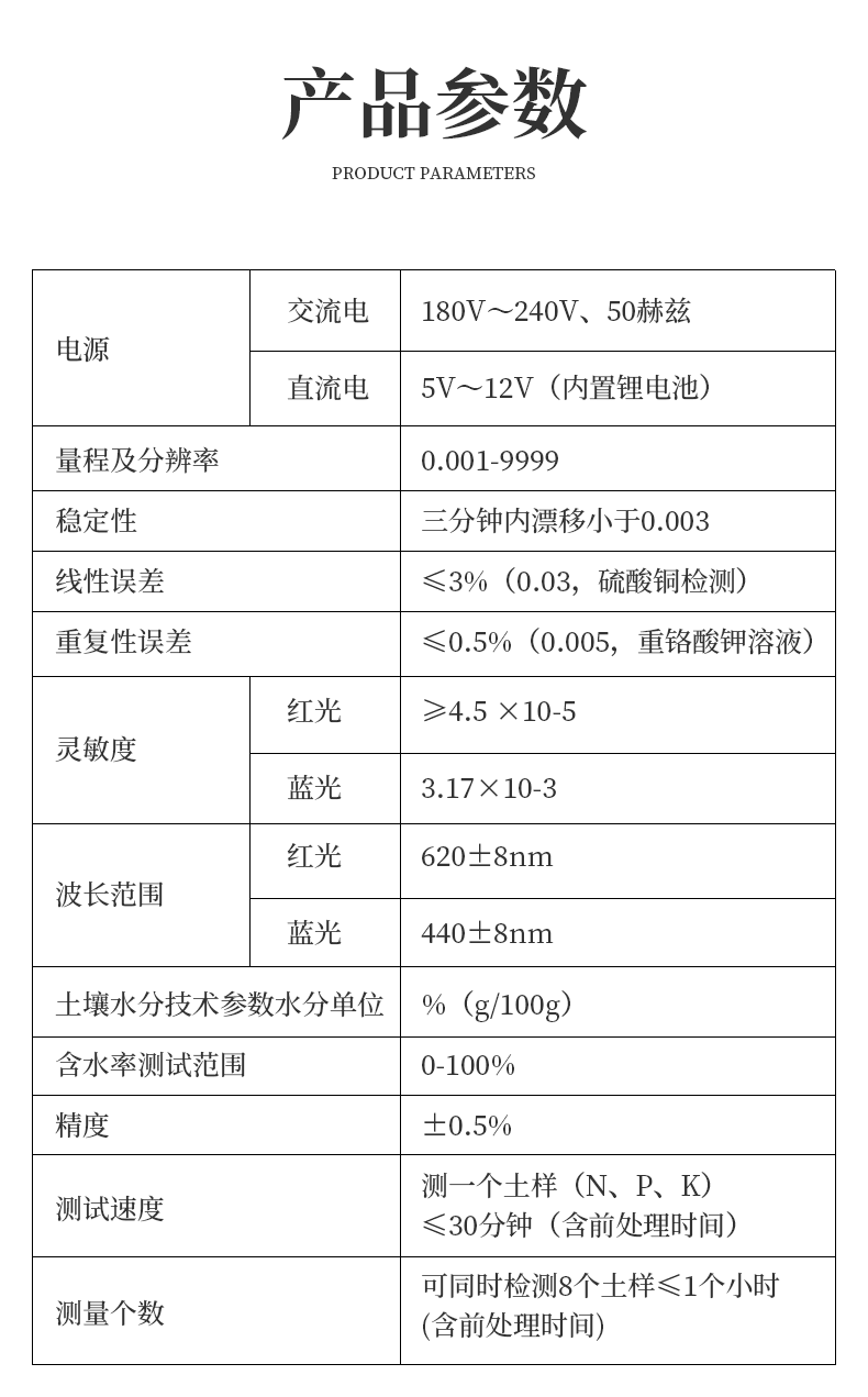 | 1.電源:交直流兩用,交流電:180V~240V、50赫茲;直流電:5V~12V(內(nèi)置鋰電池) | 2.量程及分辨率:0.001-9999 | 3.穩(wěn)定性:三分鐘內(nèi)漂移小于0.003 | 4.線性誤差:≤3%(0.03,硫酸銅檢測) | 5.重復(fù)性誤差:≤0.5%(0.005,重鉻酸鉀溶液) | 6.靈敏度:紅光≥4.5 ×10-5 藍(lán)光≥3.17×10-3 | 7.波長范圍:紅光620±8nm 藍(lán)光440±8nm | 8.土壤水分技術(shù)參數(shù)水分單位:%(g/100g)含水率測試范圍:0-100% 精度:±0.5% | 9.土壤中速效N、P、K三種養(yǎng)分一次性同時(shí)浸提測定、科學(xué)指導(dǎo)施肥 | 10.肥料中氮(N)、磷(P)、鉀(K)等養(yǎng)分同時(shí)、快速、準(zhǔn)確檢測 | 11.測試速度:測一個(gè)土樣(N、P、K)≤30分鐘(含前處理時(shí)間) | 12.可同時(shí)檢測8個(gè)土樣≤1個(gè)小時(shí)(含前處理時(shí)間) | 13.數(shù)據(jù)打?。簝?nèi)置一鍵式熱敏打印機(jī)(國內(nèi)率先專利設(shè)計(jì)) | 14.儀器尺寸:492*305*165mm |