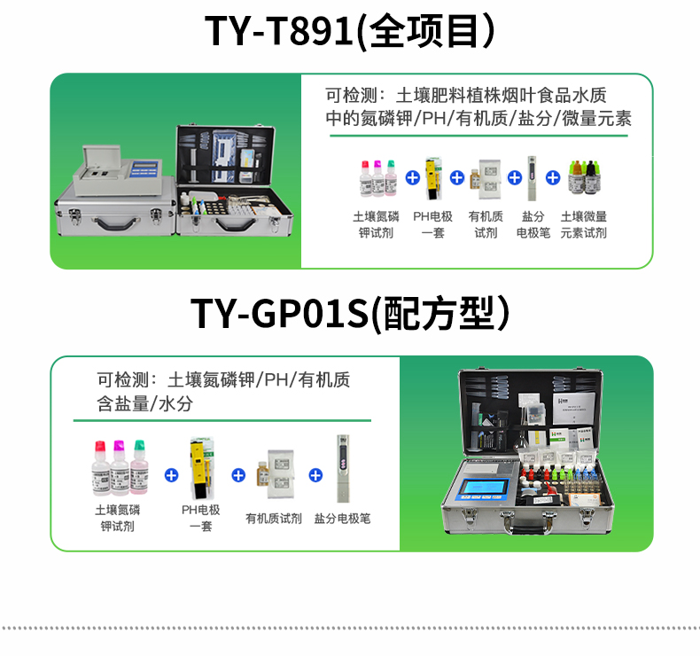 | 土壤養(yǎng)分:● 銨態(tài)氮、速效磷、速效鉀、水份、有機(jī)質(zhì)、酸堿度(pH試紙法)等項(xiàng); | 肥料養(yǎng)分:● 單質(zhì)化肥中的氮、磷、鉀; ● 復(fù)(混)合肥及尿素中的銨態(tài)氮、磷、鉀; ● 有機(jī)肥中速效氮、速效磷、速效鉀、全氮、全磷、全鉀、pH、有機(jī)質(zhì)等。 |