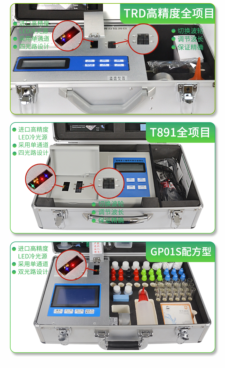 | 1、《機(jī)箱/藥劑一體式鋁合金機(jī)箱》設(shè)計(jì),便于攜帶、堅(jiān)固耐用,配套成品藥劑。 | 2、微電腦控制,數(shù)字化線路、程序化設(shè)計(jì),液晶顯示,交直流兩用,可野外流動(dòng)測試,大程度降低操作者的失誤和勞動(dòng)強(qiáng)度。 | 3、分辨率:0.001,觸摸式按鍵,內(nèi)置熱敏打印機(jī),可打印測試結(jié)果。 | 4、可檢測土壤及化肥、有機(jī)肥、植株中的速效氮、有效磷、速效鉀、全氮、全磷、全鉀、有機(jī)質(zhì)含量,土壤酸堿度,含鹽量(擴(kuò)展)。 | 5、土壤養(yǎng)分速測儀采用高亮度 LED 燈作為光源, 硅半導(dǎo)體作為信號(hào)接收系統(tǒng), 壽命長達(dá)10萬小時(shí)級(jí)別。光源穩(wěn)定,一致性好。 | 6、比色槽部分采用單通道、雙光路設(shè)計(jì),無機(jī)械位移及磨損,光路測試定位**,保證測定結(jié)果精度。 |