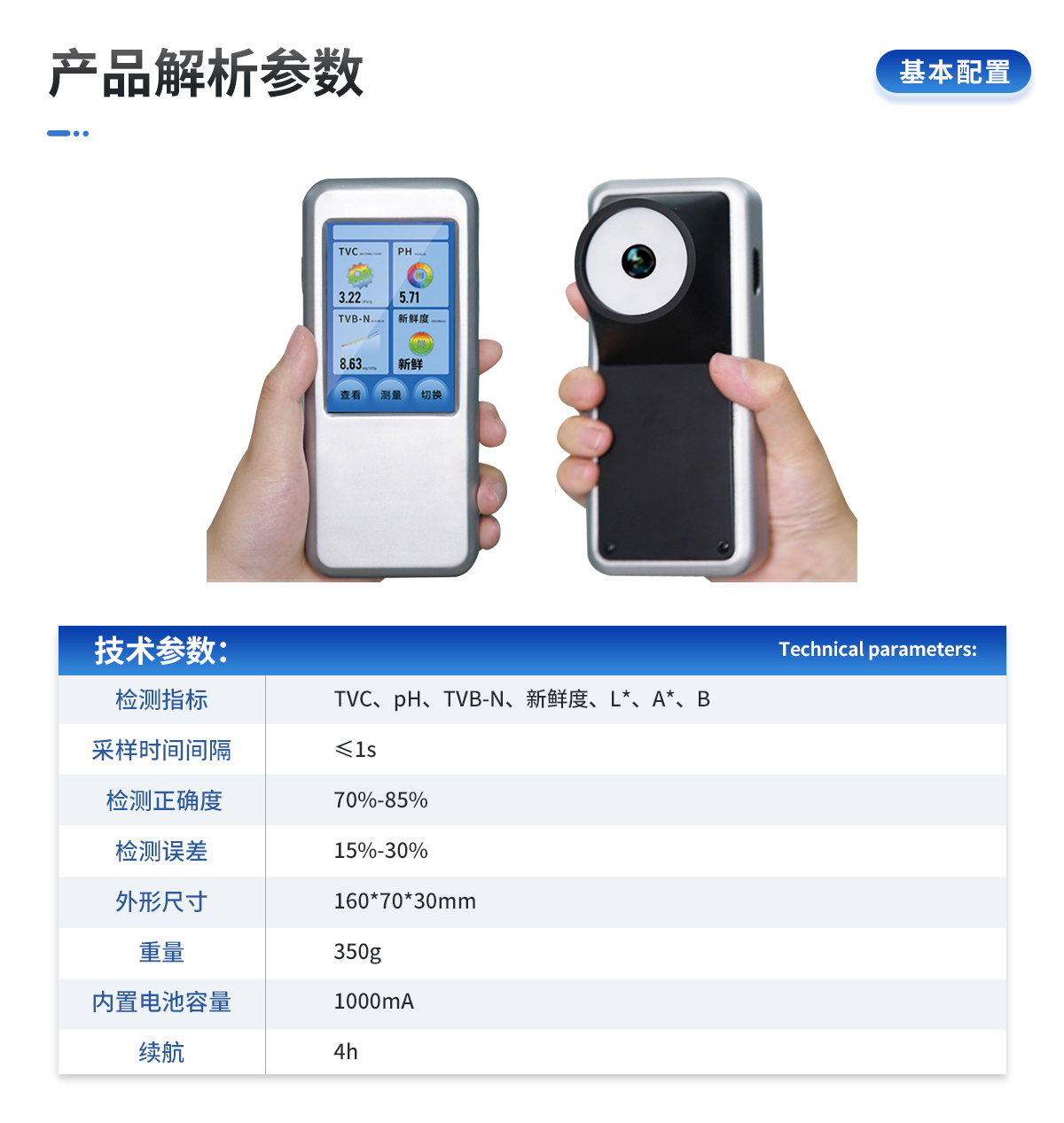 | 1. ※檢測(cè)指標(biāo):TVC、pH、TVB-N、新鮮度、L*、A*、B | 2. 采樣時(shí)間間隔:≤1s | 3. 檢測(cè)正確度:70%-85% | 4. 檢測(cè)誤差:15%-30% | 10. 外形尺寸:160*70*30mm | 11. 重量:350g | 12. 內(nèi)置電池容量:1000mA | 13. 續(xù)航:4h |