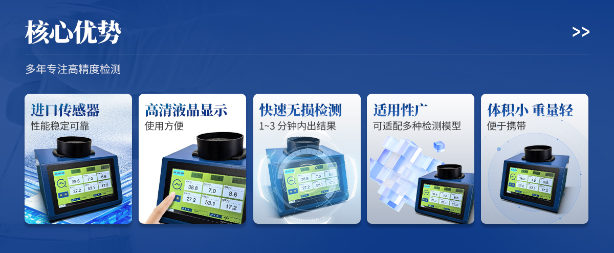 | ◆ 進(jìn)口核心檢測傳感器,性能穩(wěn)定可靠; | ◆ 快速無損檢測,1~3 分鐘內(nèi)出結(jié)果; | ◆ 10 吋觸屏操作簡單,使用方便; | ◆ 適用性廣,可適配多種檢測模型; | ◆ 支持客戶自建模型; | ◆ 體積小、重量輕,便于攜帶; |