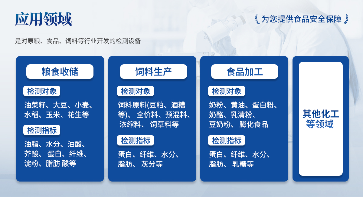 檢測對(duì)象:飼料原料(豆粕、酒糟等)、全價(jià)料、預(yù)混料、濃縮料、飼草料等 檢測指標(biāo):蛋白、纖維、水分、脂肪、灰分等; | ◆ 食品加工: