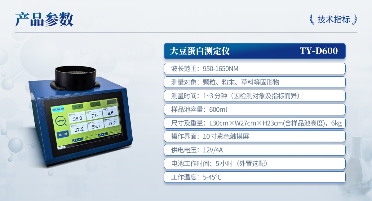 | 波長范圍:950-1650nm | 測量對(duì)象:顆粒、粉末、草料等固形物 | 測量時(shí)間:1~3 分鐘(因檢測對(duì)象及指標(biāo)而異) | 樣品池容量:600ml | 尺寸及重量:L30cm×W27cm×H23cm(含樣品池高度),6kg | 操作界面:10 寸彩色觸摸屏 | 供電電壓:12V/4A | 電池工作時(shí)間:5 小時(shí)(外置選配) | 工作溫度:5-45℃ |