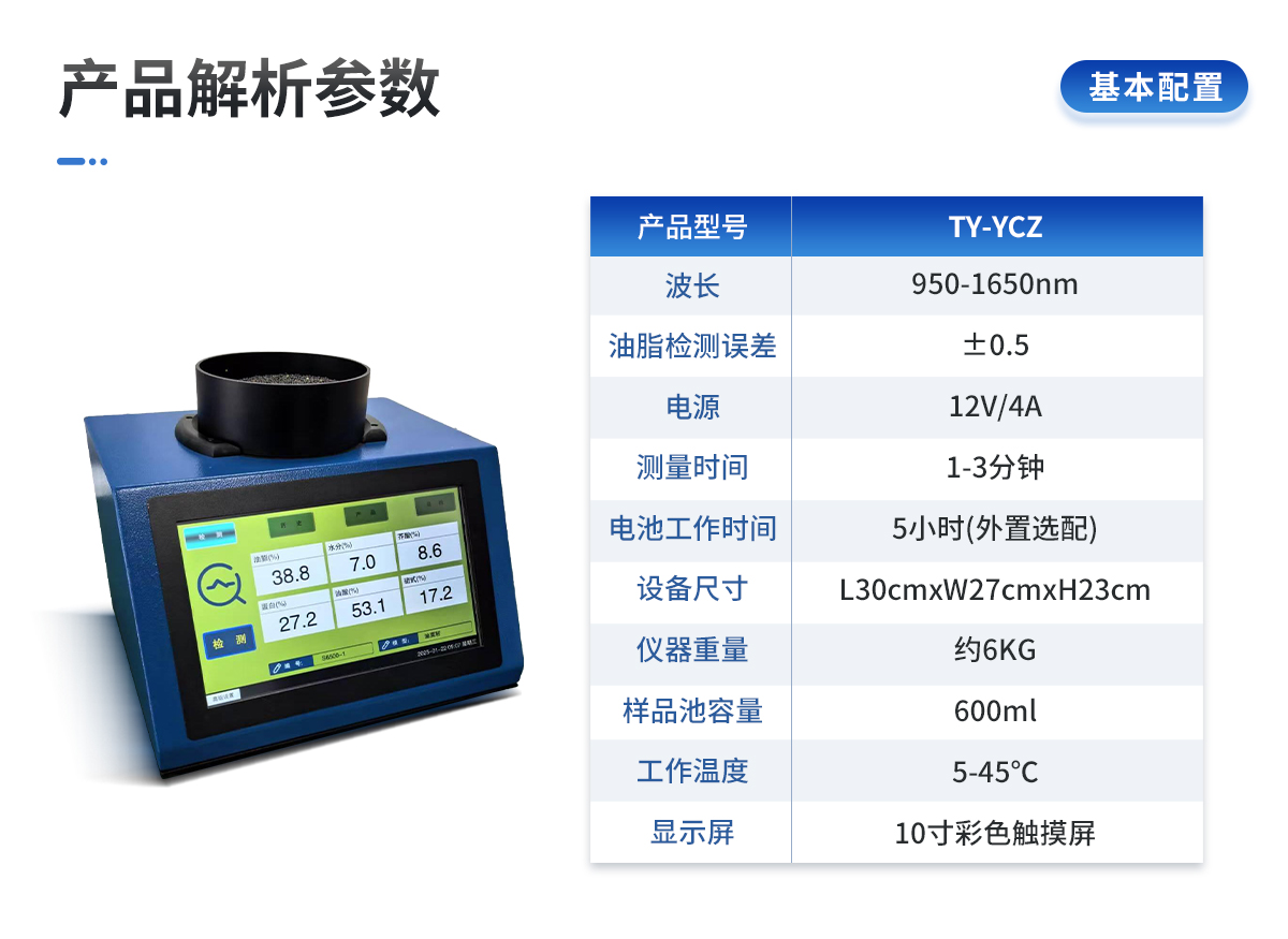| 波長(zhǎng)范圍:950-1650nm | 測(cè)量對(duì)象:顆粒、粉末、草料等固形物 | 測(cè)量時(shí)間:1~3 分鐘(因檢測(cè)對(duì)象及指標(biāo)而異) | 樣品池容量:600ml | 尺寸及重量:L30cm×W27cm×H23cm(含樣品池高度),6kg | 操作界面:10 寸彩色觸摸屏 | 供電電壓:12V/4A | 電池工作時(shí)間:5 小時(shí)(外置選配) | 工作溫度:5-45℃ | 油脂檢測(cè)誤差:+-0.5 |