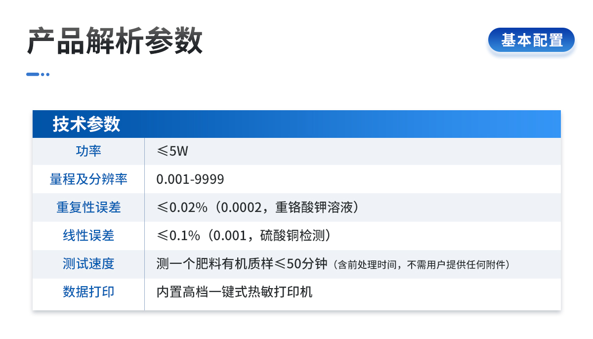 | 電源:交流 220±22V 直流 12V+5V(可用車(chē)載電源也可選擇儀器內(nèi)置鋰電池) | 功率: ≤5W | 量程及分辨率:0.001-9999 | 重復(fù)性誤差: ≤0.02%(0.0002,重鉻酸鉀溶液) | 儀器穩(wěn)定性:兩個(gè)小時(shí)內(nèi)數(shù)字漂移小于0.2%(0.002,透光度測(cè)量)。儀器開(kāi)機(jī)預(yù)熱5分鐘后,一個(gè)小時(shí)內(nèi)顯示數(shù)字無(wú)漂移(透光度測(cè)量),兩個(gè)小時(shí)內(nèi)數(shù)字漂移不超過(guò)0.2%(0.002,透光度測(cè)量)。 | 線(xiàn)性誤差: ≤0.1%(0.001,硫酸銅檢測(cè)) | 靈敏度:紅光≥4.5 ×10-5 藍(lán)光≥3.17×10-3 綠光≥2.35×10-3 橙光≥2.13×10-3 | 波長(zhǎng)范圍 :紅光:680±2nm; 藍(lán)光:420±2nm;綠光:510±2nm;橙光:590±10nm | 數(shù)據(jù)打印:內(nèi)置新型一鍵式熱敏打印機(jī) | 預(yù)留232數(shù)據(jù)接口,可與電腦相連進(jìn)行數(shù)據(jù)傳輸。 | 儀器尺寸:43×34.5×19cm, 主機(jī)凈重:5.1kg |