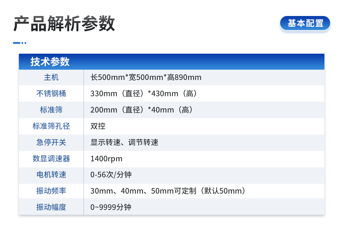 | 1、主機:長500mm*寬500mm*高890mm | 2、不銹鋼桶:330mm(直徑)*430mm(高) | 3、標(biāo)準篩:200mm(直徑)*40mm(高) | 4、標(biāo)準篩孔徑:10mm,7mm,5mm,3mm,2mm,1mm,0.5mm,0.25mm。(可選配其他規(guī)格孔徑) | 5、急停開關(guān):雙控 | 6、數(shù)顯調(diào)速器:顯示轉(zhuǎn)速、調(diào)節(jié)轉(zhuǎn)速 | 7、電機轉(zhuǎn)速:1400 rpm | 8、振動頻率:0-56次/分鐘 | 9、振動幅度:30mm、40mm、50mm可定制(默認50mm) | 10、計時:數(shù)顯計時器 | 11、定時范圍:0~9999分鐘 | 12、電源:220V 50Hz 120W | 13、漏電保護器:10A |