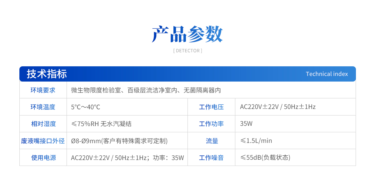 | ① 環(huán)境要求:微生物限度檢驗室、百級層流潔凈室內(nèi)、無菌隔離器內(nèi) ② 環(huán)境溫度:5℃~40℃ ③ 相對濕度:≤75%RH 無水汽凝結(jié) ④ 廢液嘴接口外徑:?8-?9mm(客戶有特殊需求可定制) ⑤ 使用電源:AC220V±22V / 50Hz±1Hz;功率:35W |